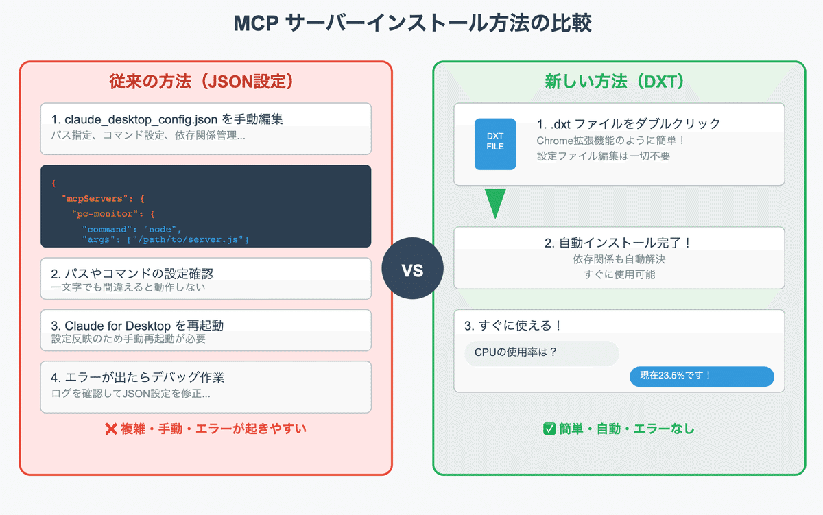 上記のような課題を解決するために、今回、Desktop Extensions (DXT)がリリースされました。