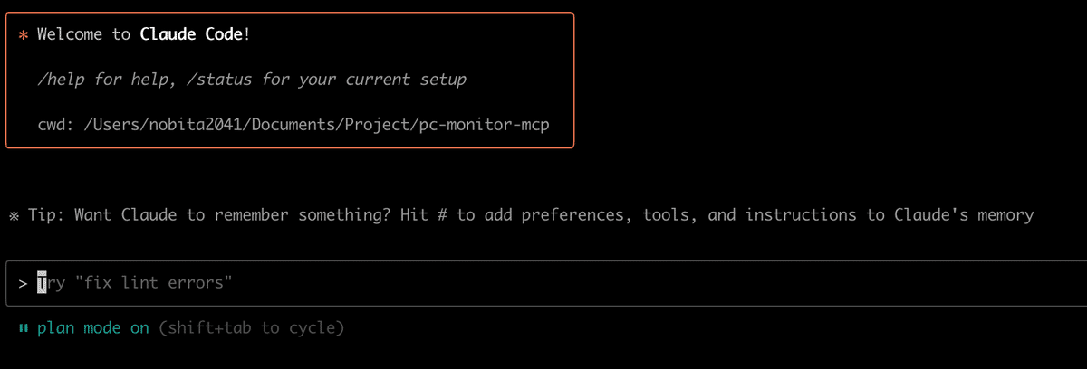 ⏸ plan mode on (shift+tab to cycle)Plan modeの利点: いきなり実装させるのではなく、詳細な仕様などを擦り合わせたのちに実装開始してくれます。これにより、より正確で要件に沿った実装が可能になります。
