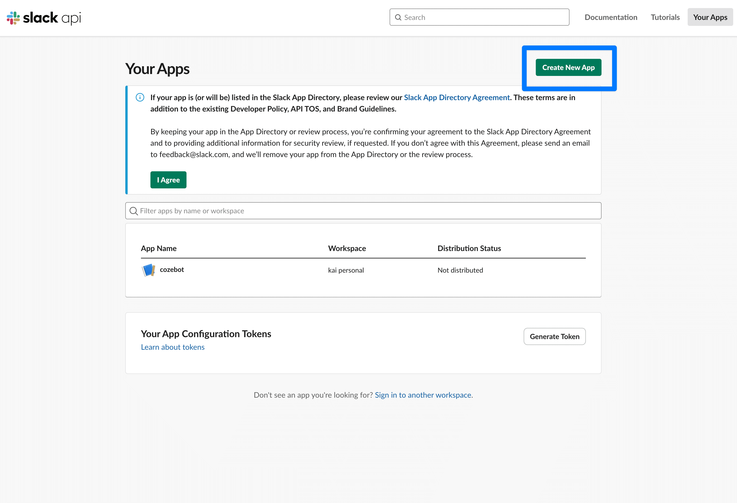 まずは、Slackにアプリを登録しましょう。これは、CozeボットをSlackに招待するための準備段階です。