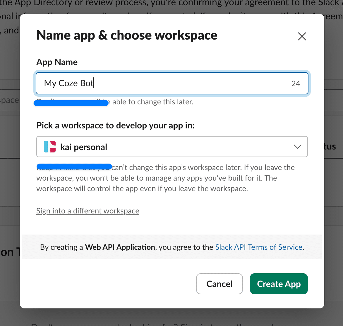 アプリ名(例:「My Coze bot」)とワークスペースを指定