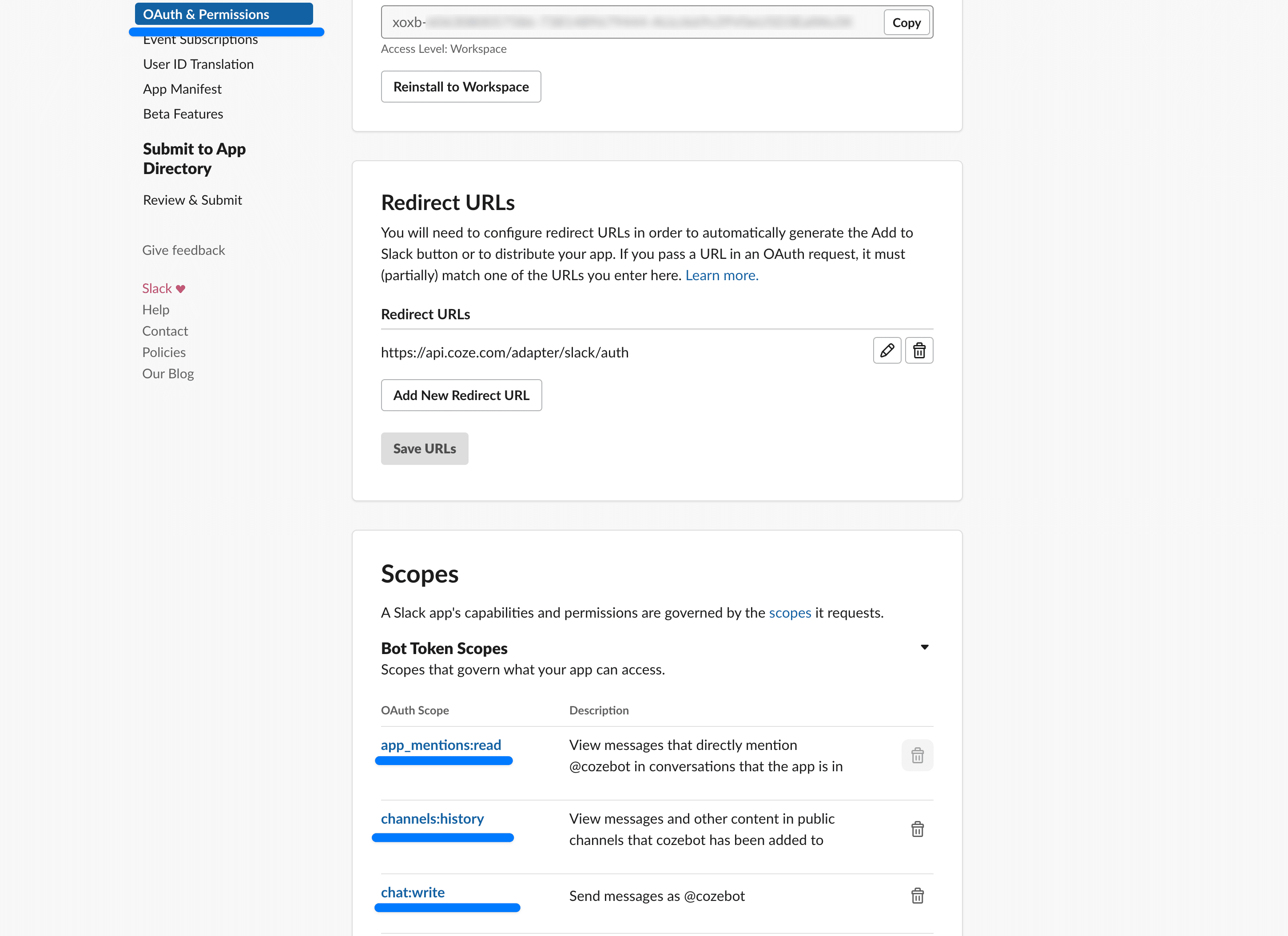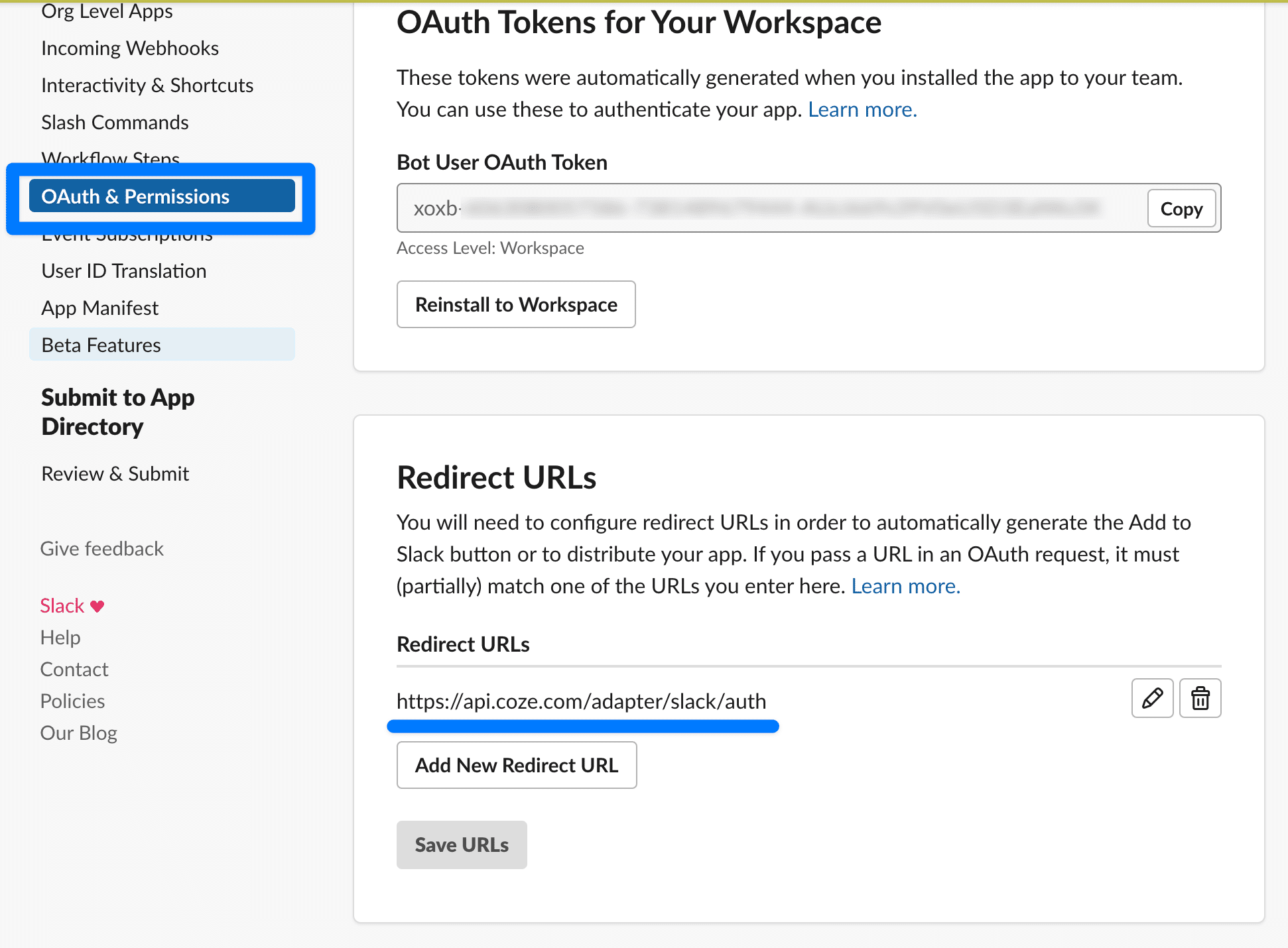 「OAuth & Permissions」→「Redirect URLs」にCozeのOAuth2 Redirect URLを追加
