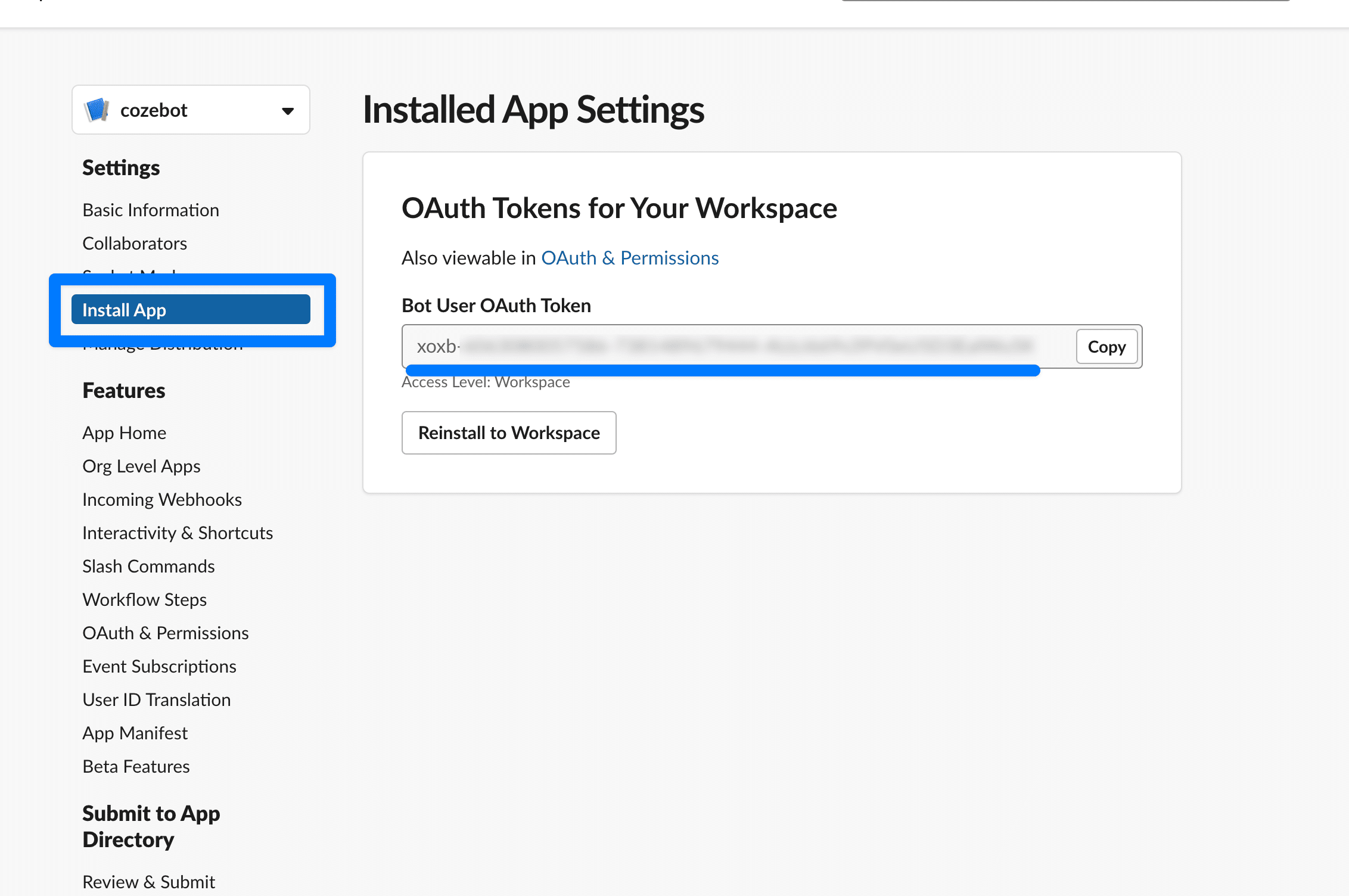 ここからは再びSlackアプリの設定画面に戻り、Cozeとの連携を完成させます。