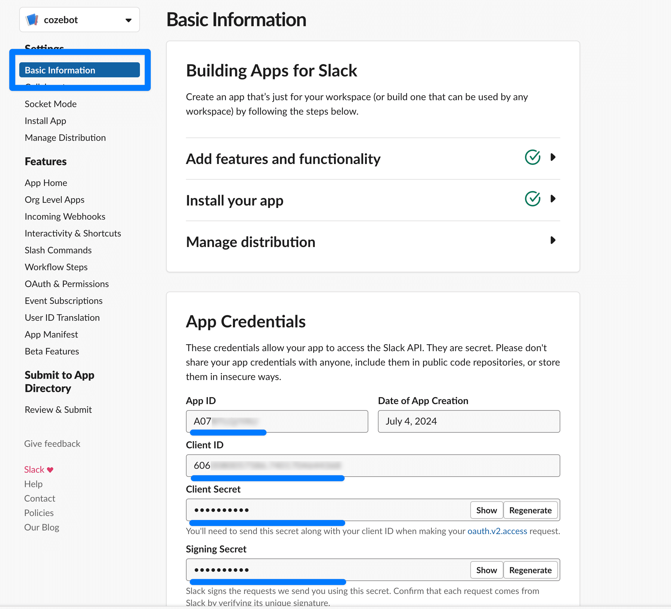 これらの情報は、後でCozeとSlackを連携する際に必要になります。大切に保管しておきましょう。