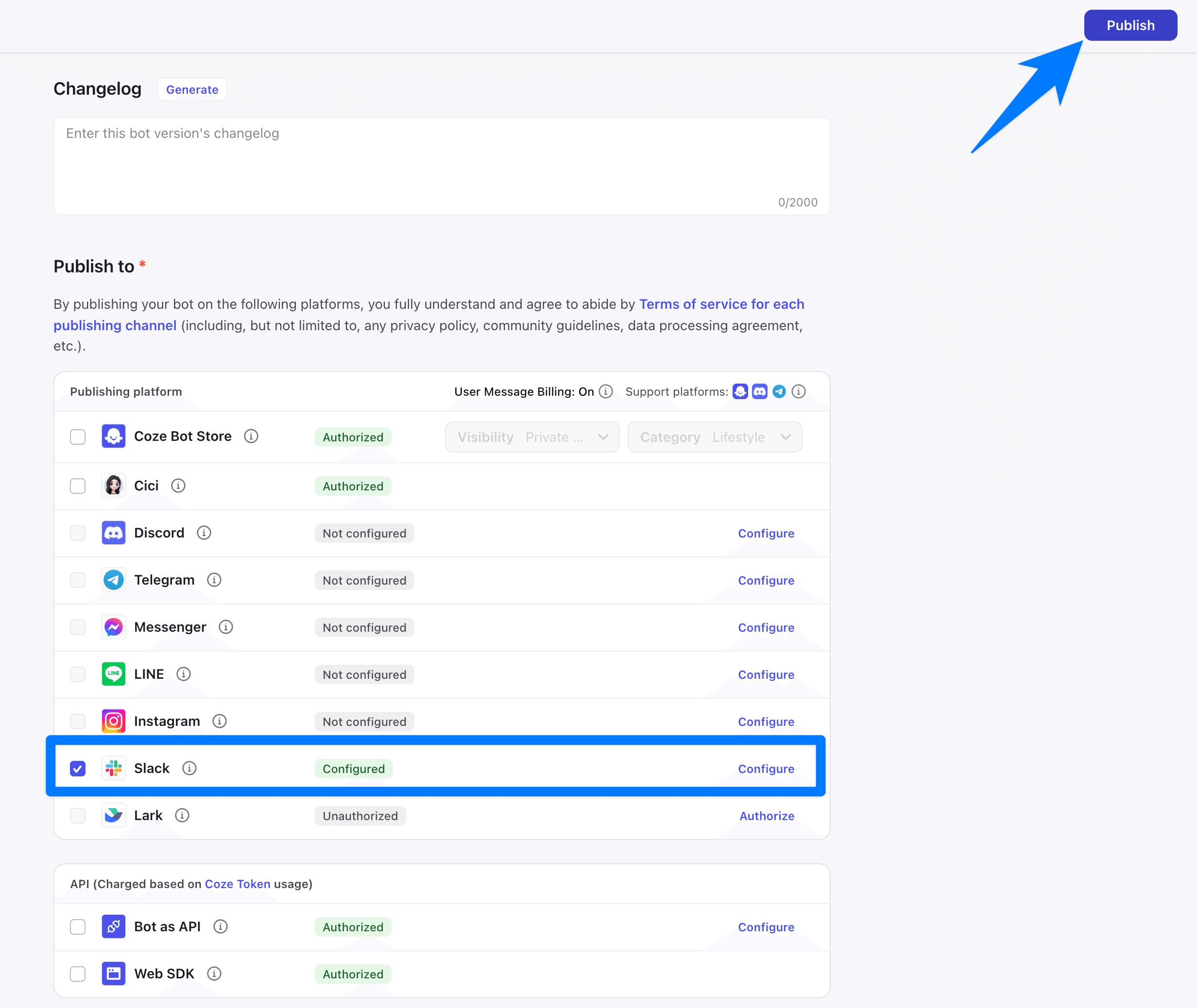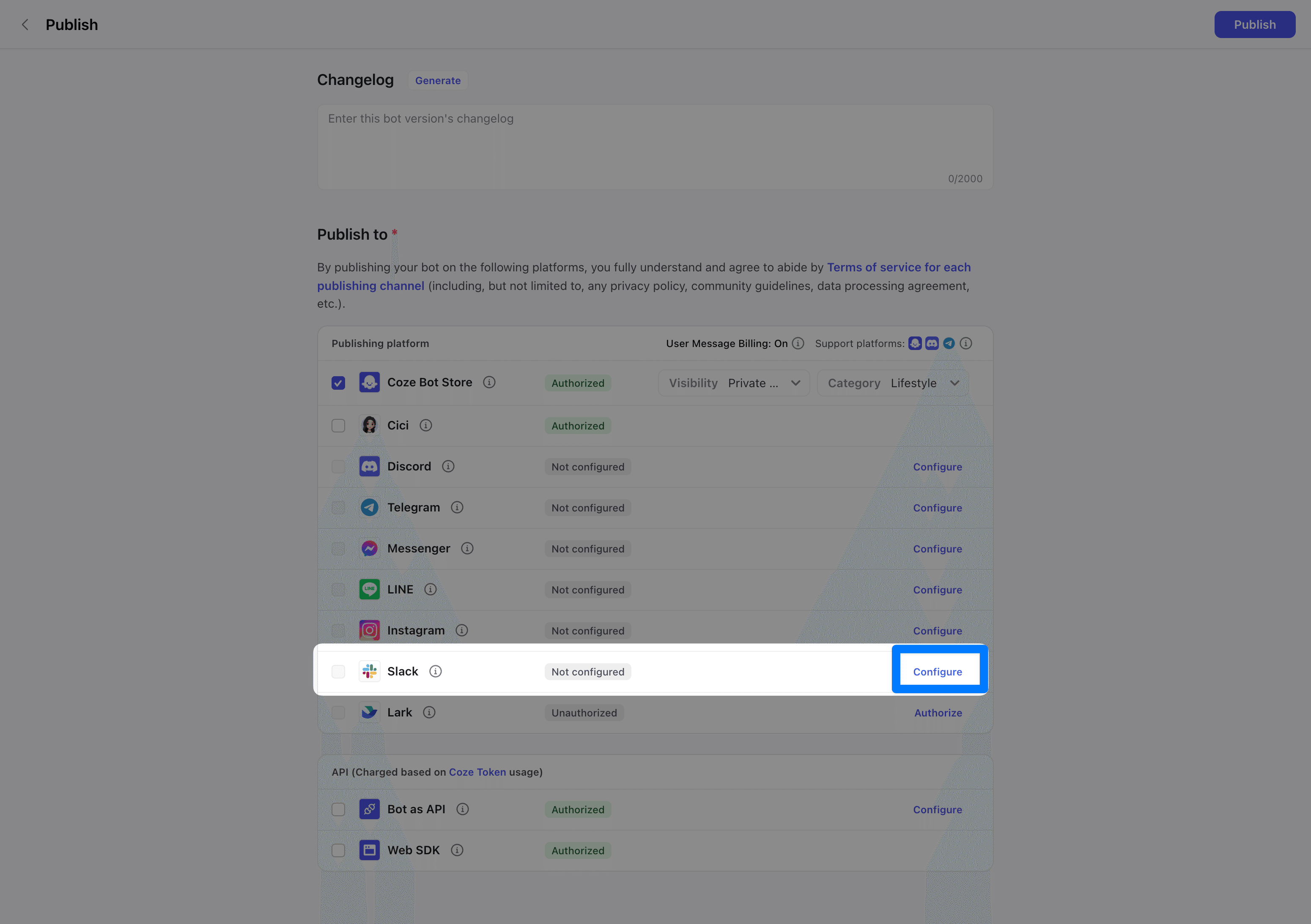「Publish」→「Slack」チャンネル→「Configure」をクリック