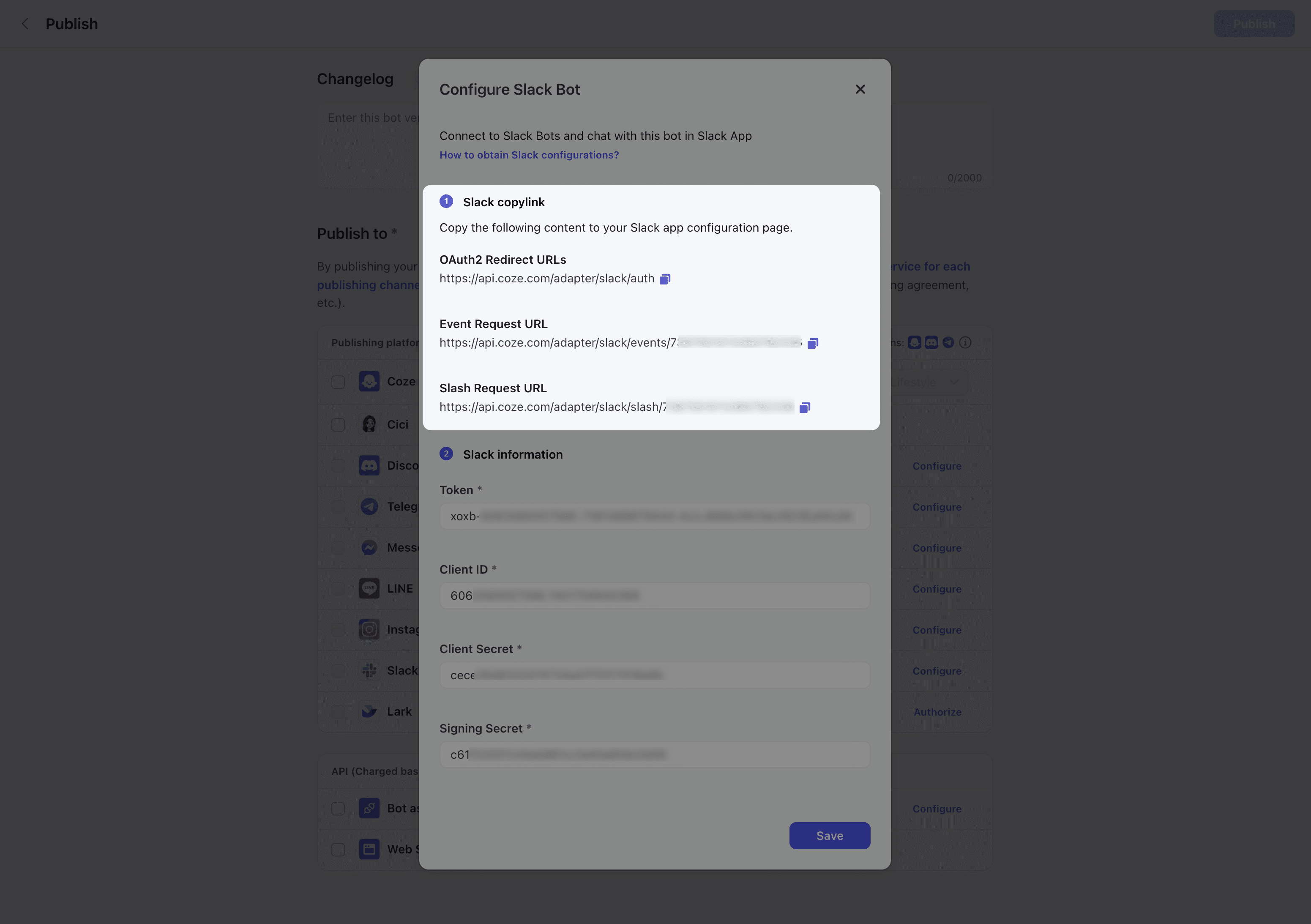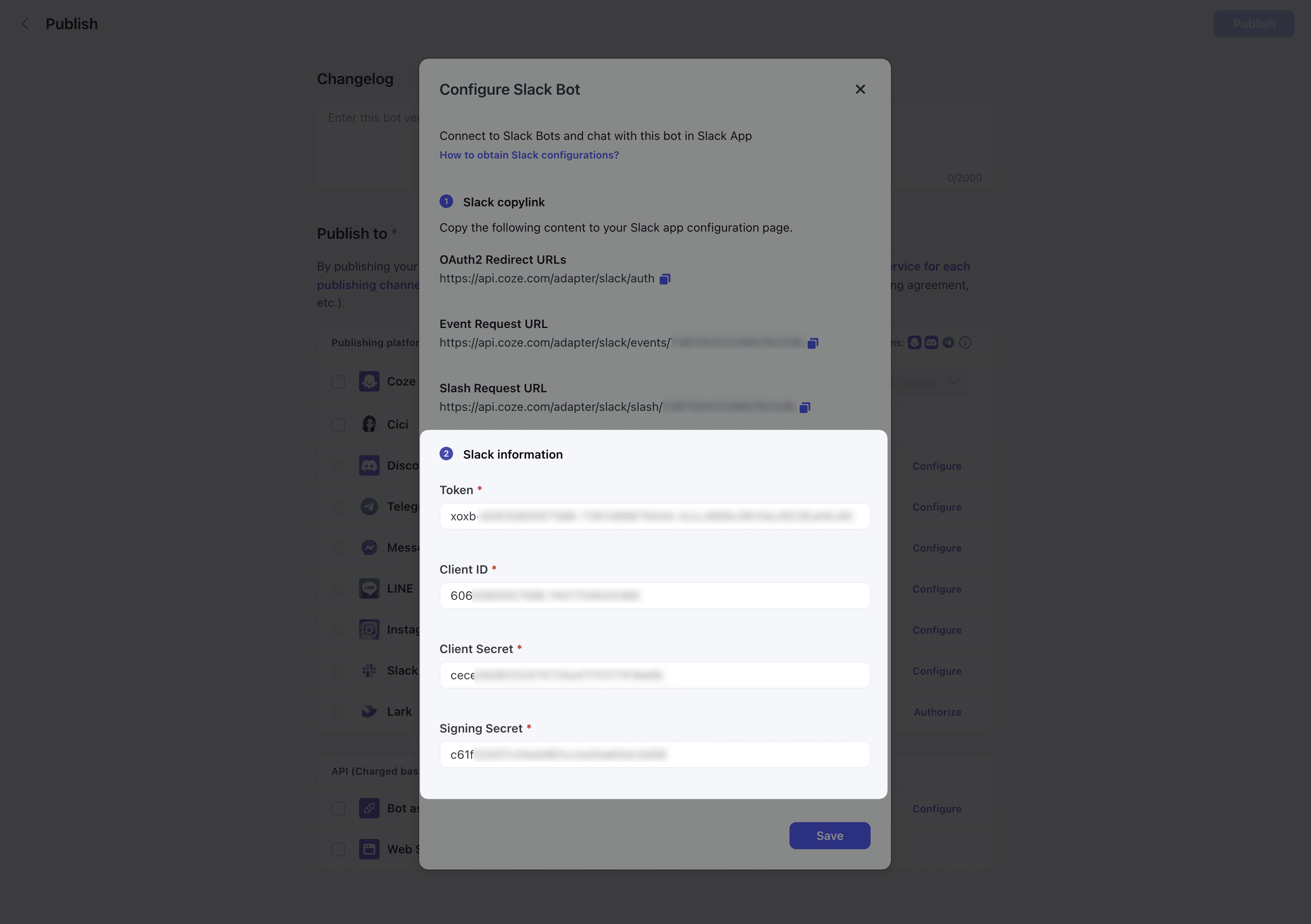 ここからはCoze側の設定です。ここでSlackとの連携情報を入力します。