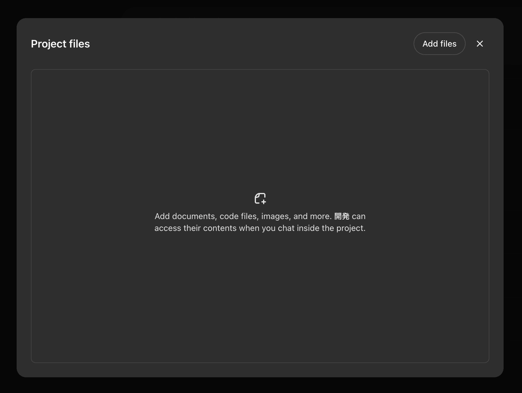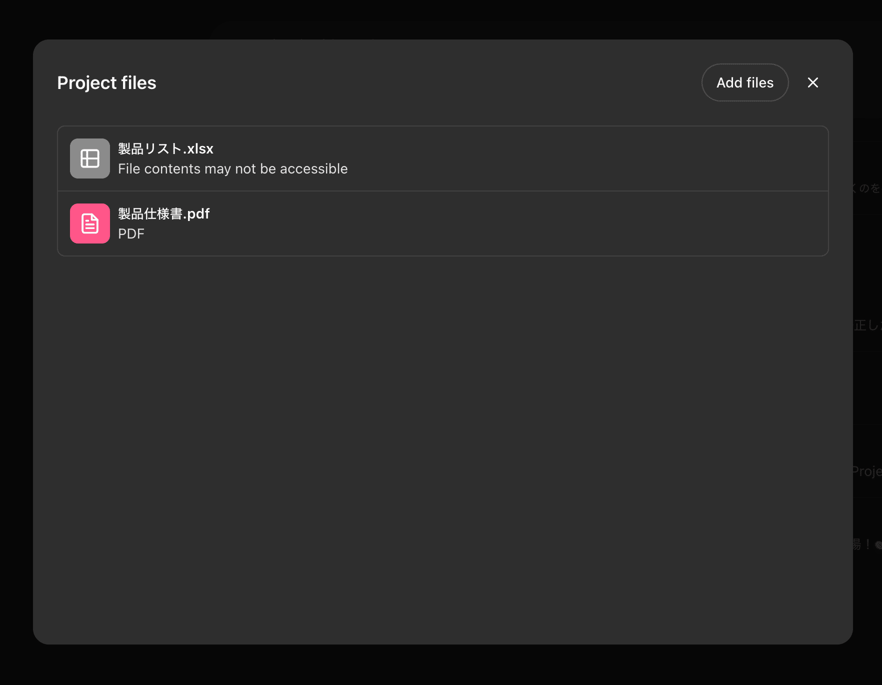 「Add files」ボタンからExcel、PDF、テキストファイル、コードファイルなどをアップロードします。