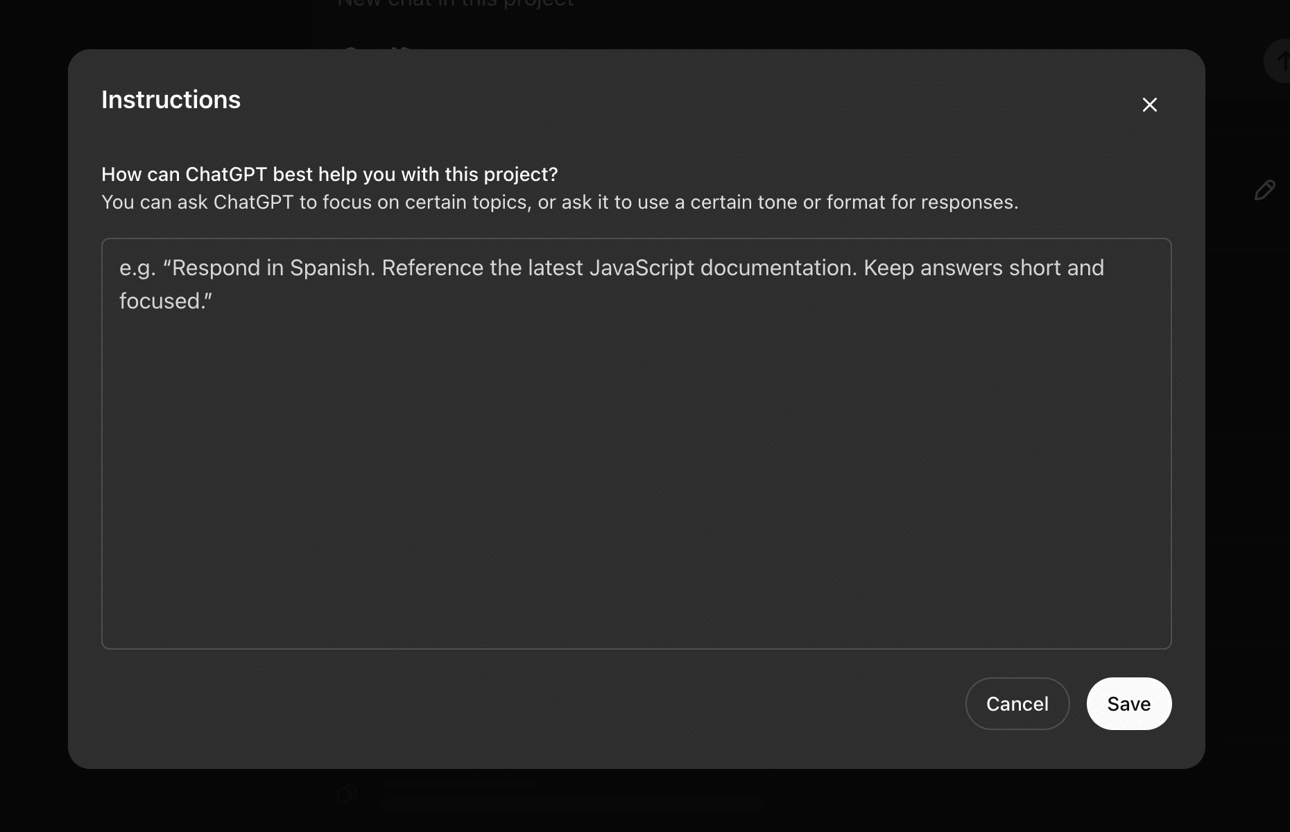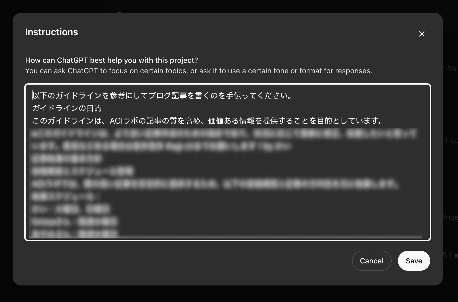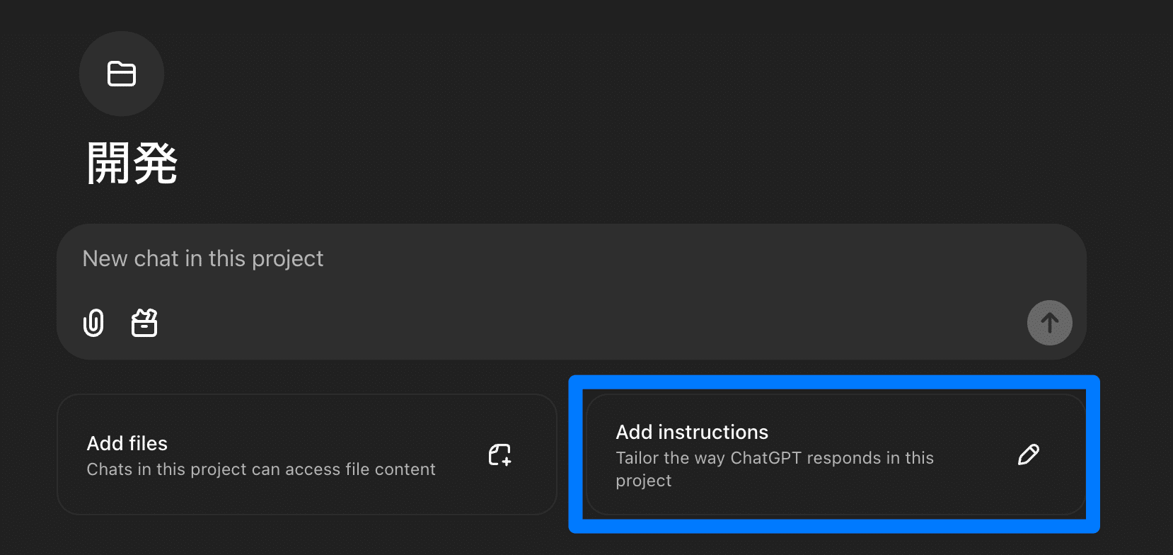 作成したプロジェクトのトップページから「Add instructions」ボタンをクリックし、プロジェクト固有のトーンや役割、回答形式を設定します。
