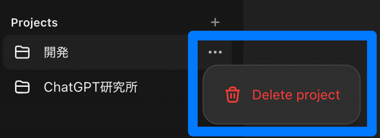 プロジェクト削除:プロジェクト名横の「・・・」ボタンから「Delete project」を選択すると、ファイルや会話、カスタムインストラクションを含め完全に削除されます。一度削除すると復元は不可能です。