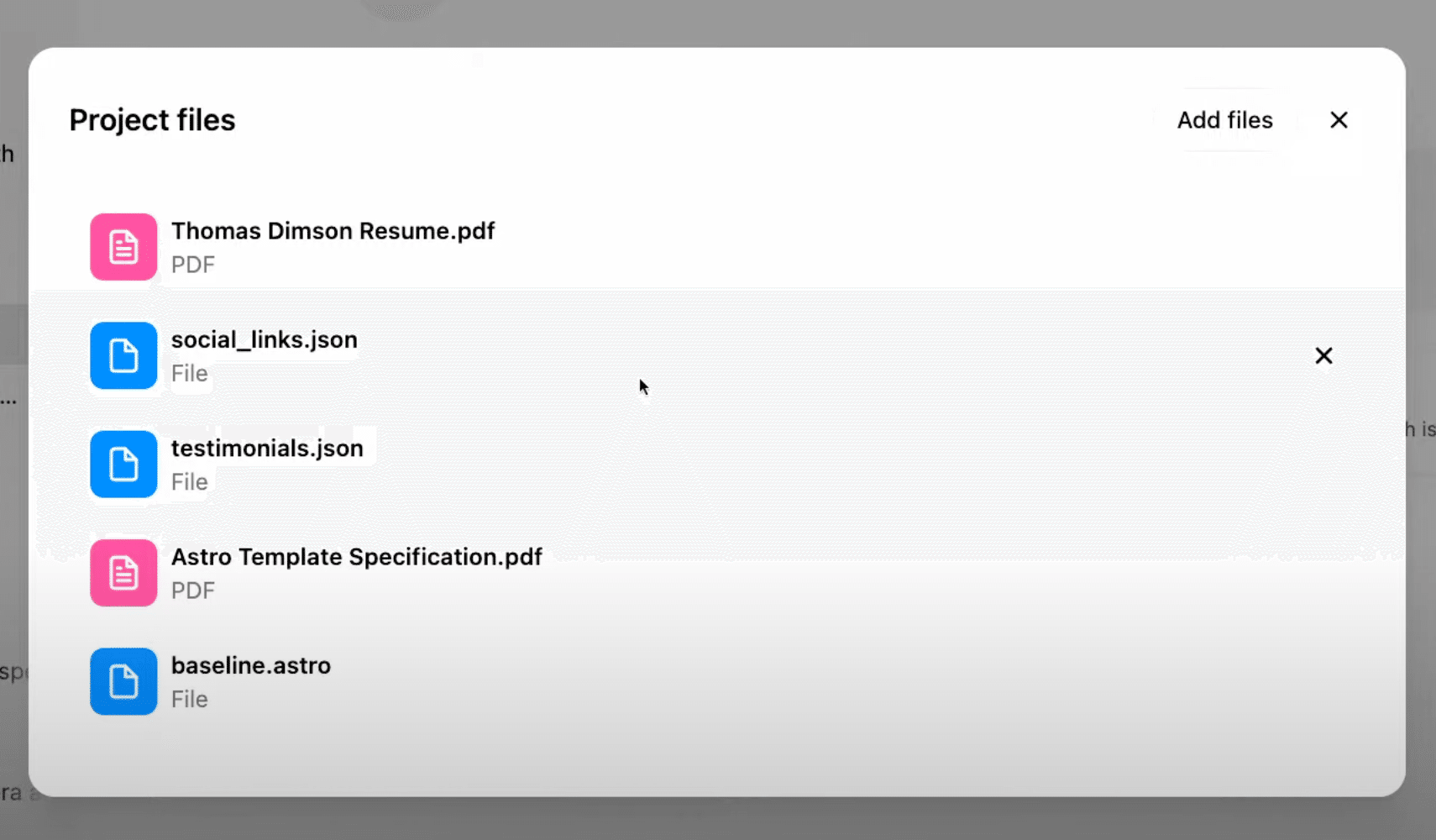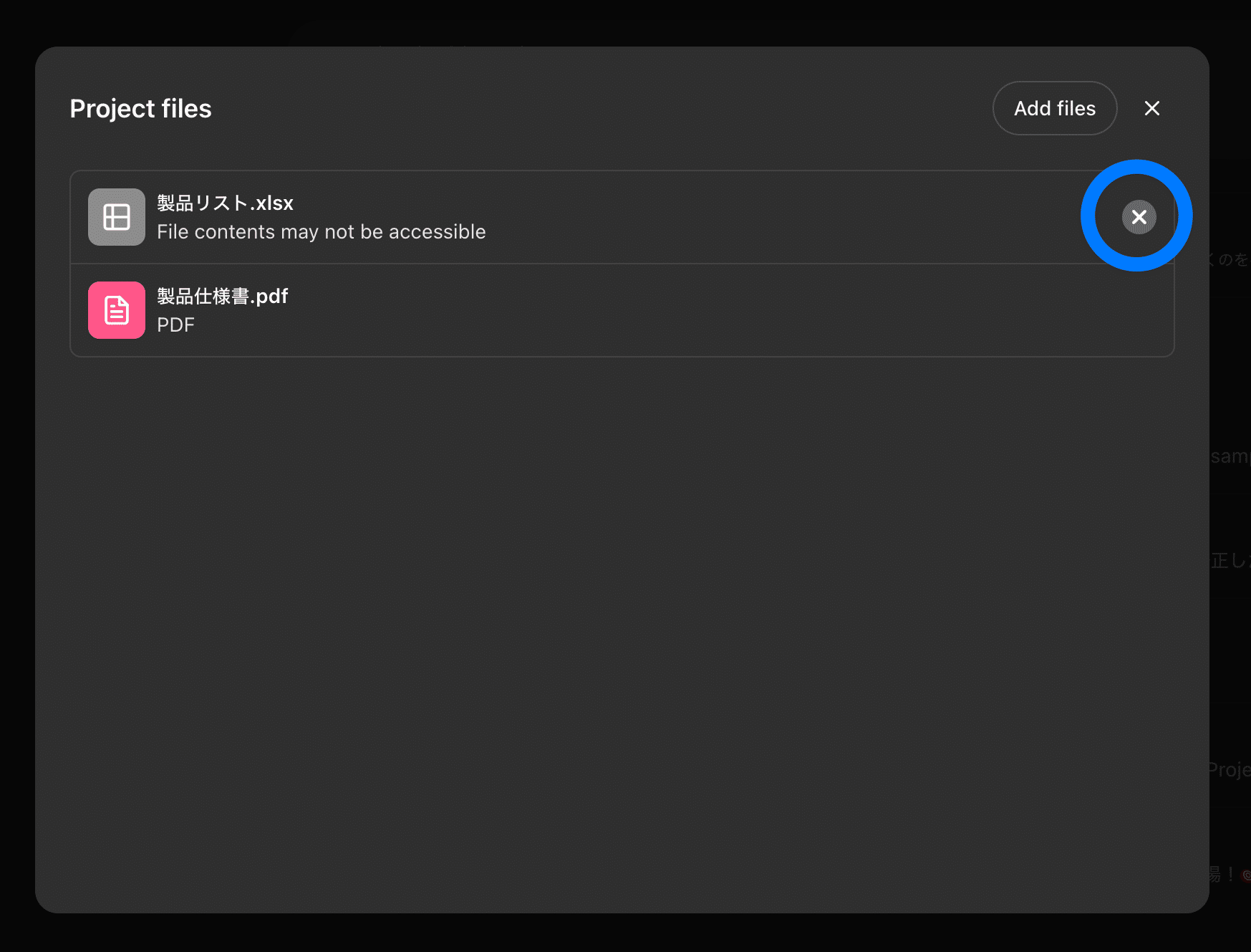 ファイル削除:同様の手順で「Add files」からファイル一覧を表示し、削除したいファイルの「x」ボタンをクリックします。