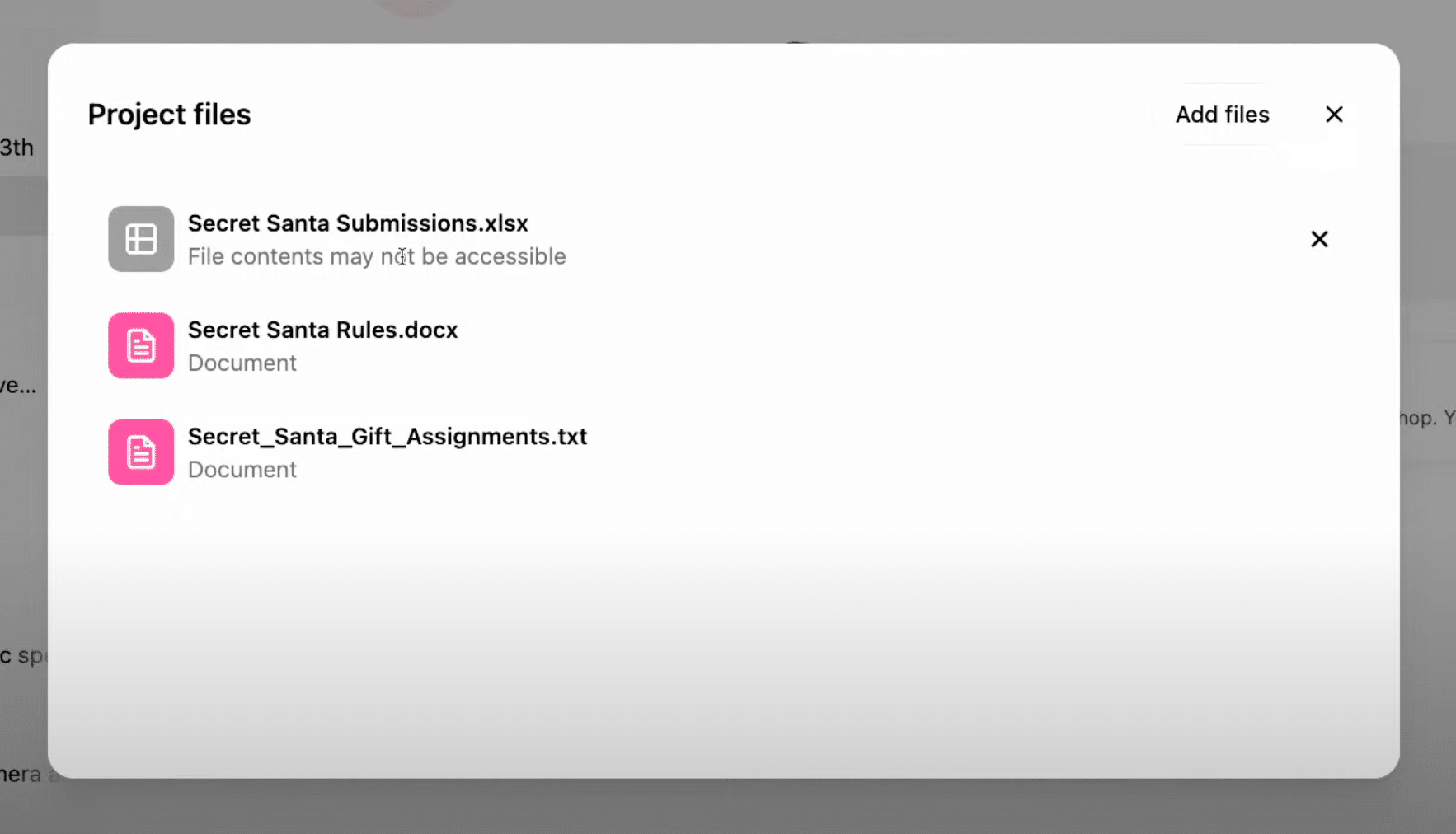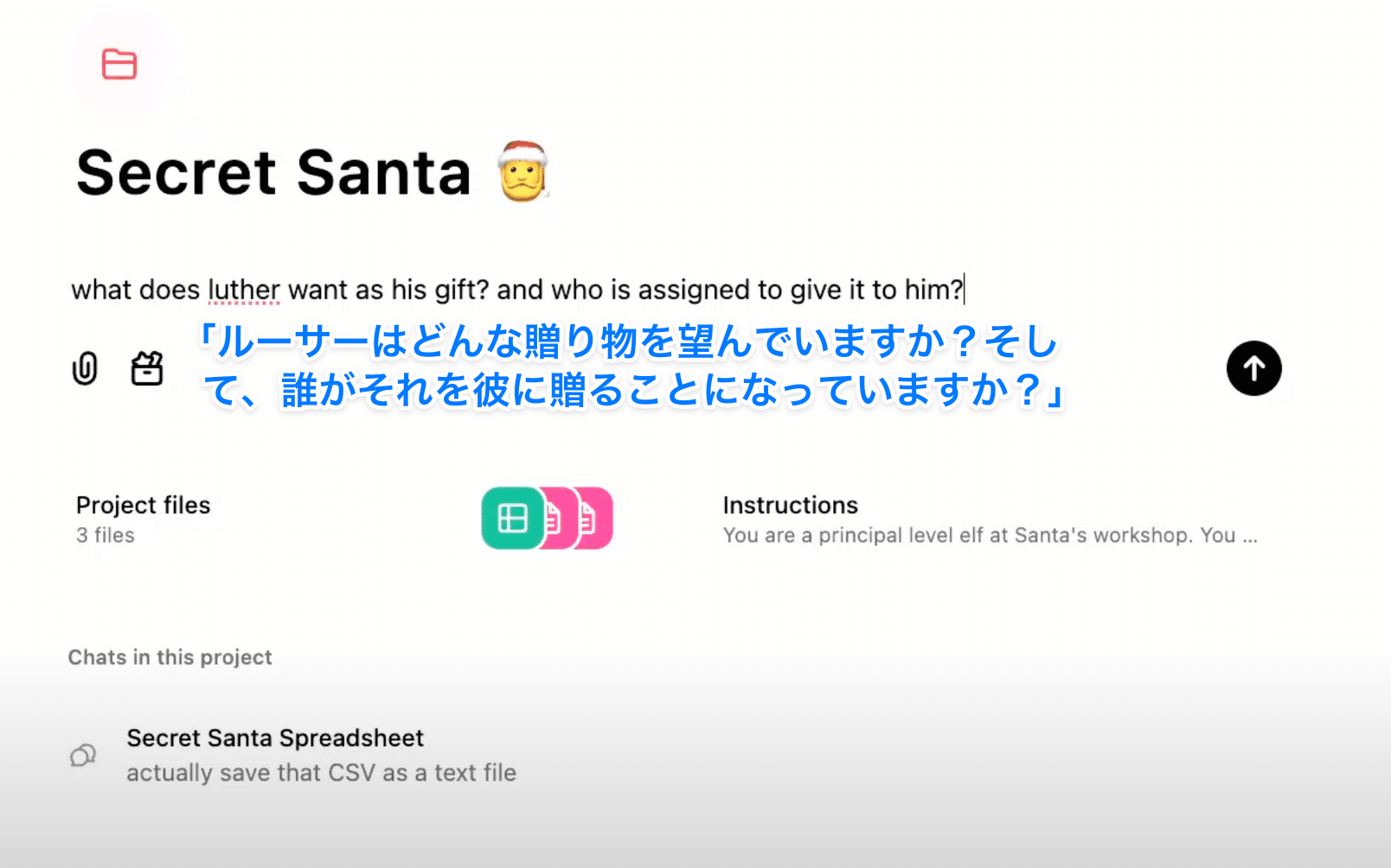 「Secret Santa」専用プロジェクトを作成し、参加者データや希望ギフト一覧、イベントルールをファイルとしてアップロード。