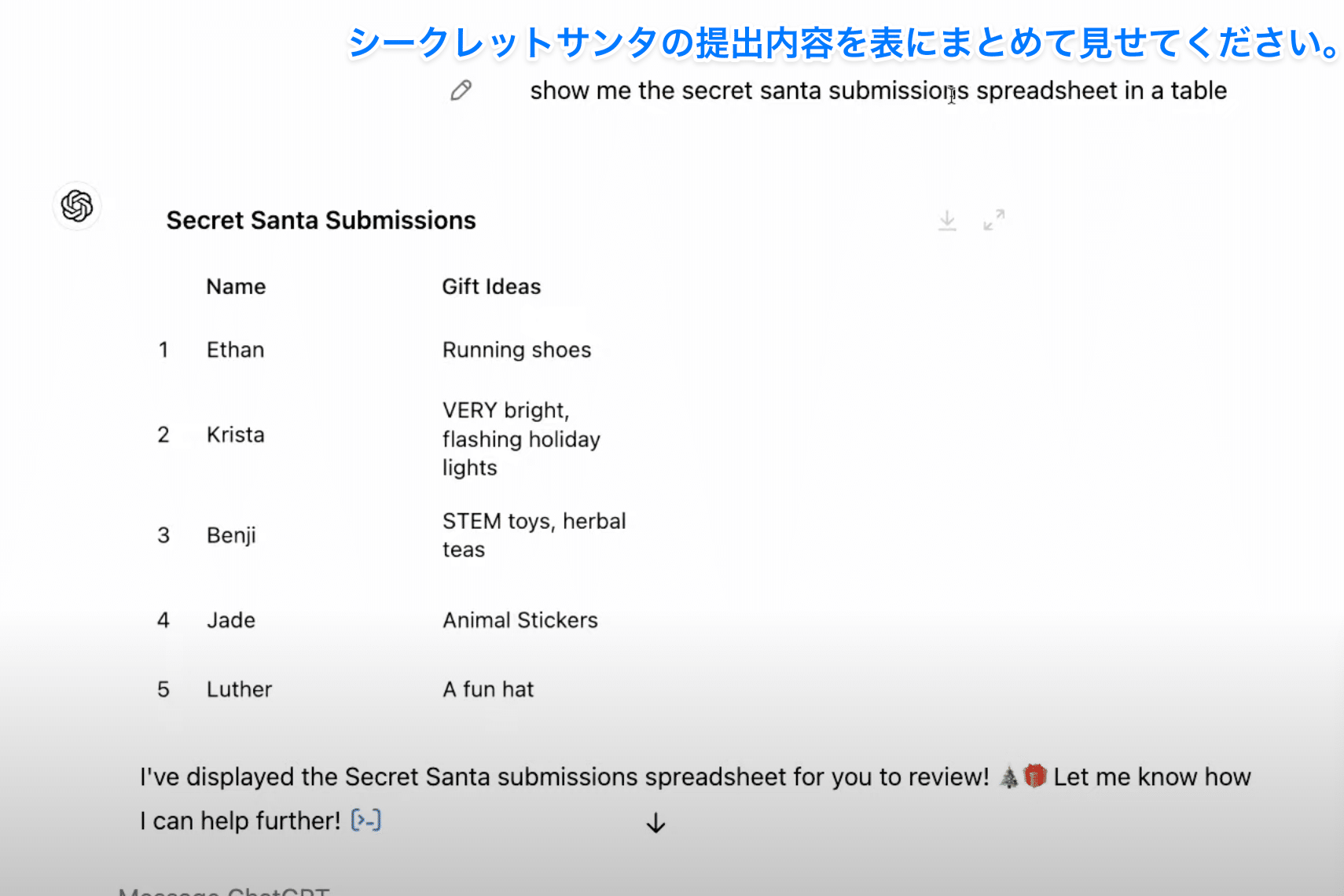 モデルがアップロード済みリストを即座に参照できるため、「誰が誰に何を贈るか?」といった組み合わせ表や、参加者向けメールのドラフトを瞬時に生成。