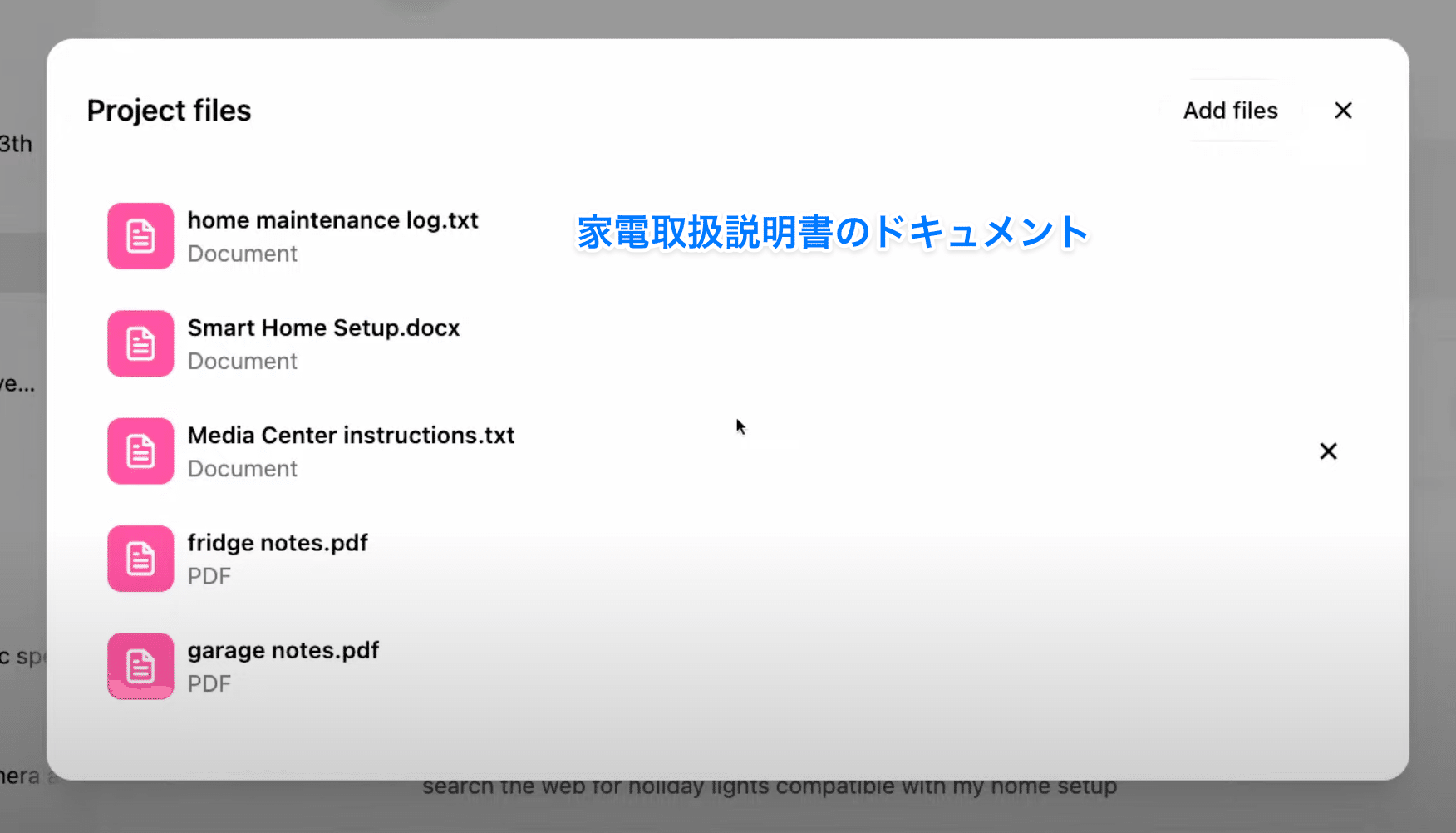 家電取扱説明書、点検ログ、交換手順PDFなどを「Home Maintenance」プロジェクトへ集約。