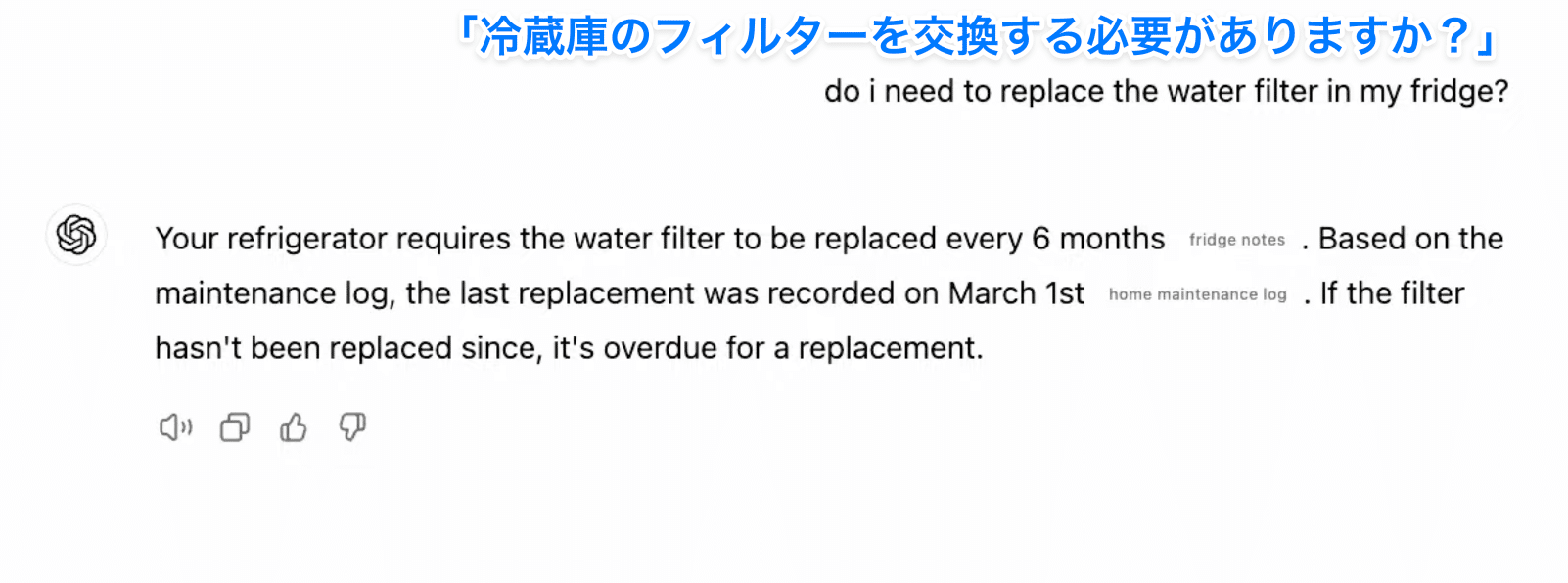 「冷蔵庫のフィルターを交換する必要がある?」と尋ねると、モデルが点検ログとマニュアルを参照し、交換時期と手順を即座に回答。