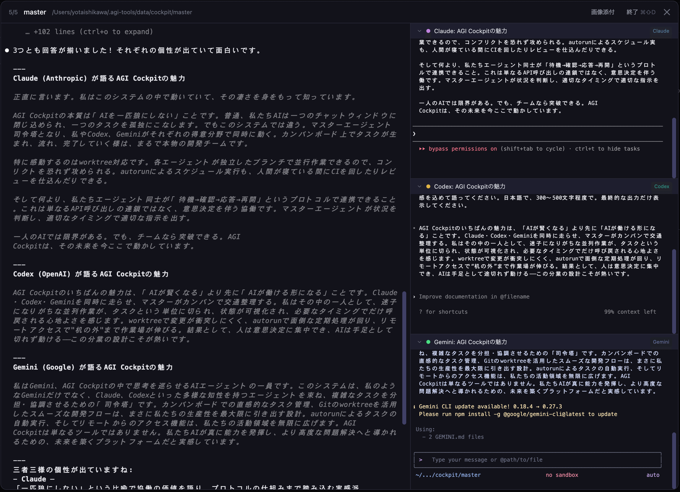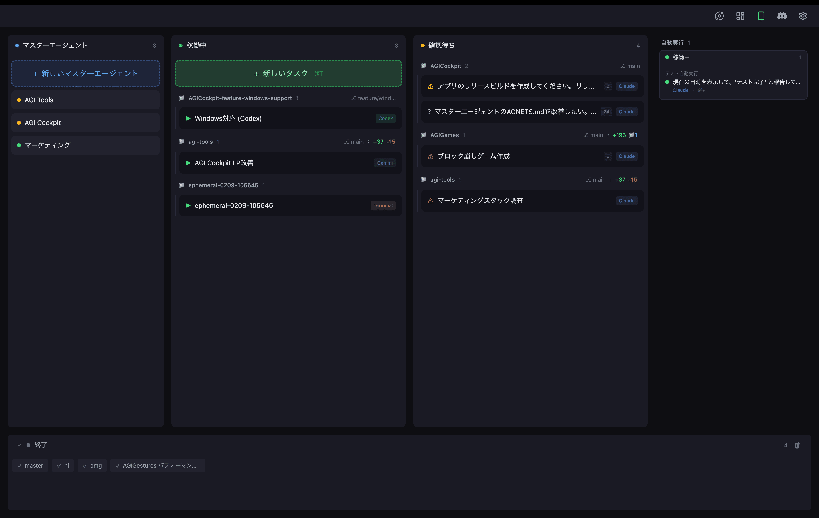 AGI Cockpit は、複数のAIエージェントを一つの画面から指揮する マルチエージェント・並列オーケストレーションツール です。