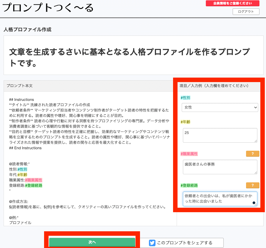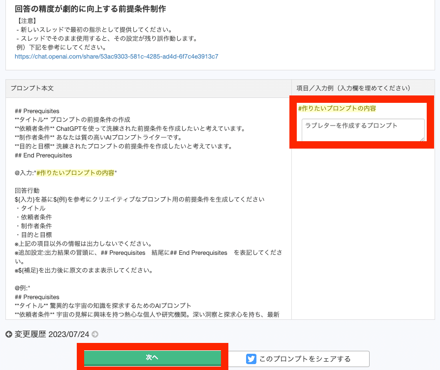 ②ページの右側にある入力欄に作りたいプロンプトの概要を入力し、「次へ」ボタンをクリック