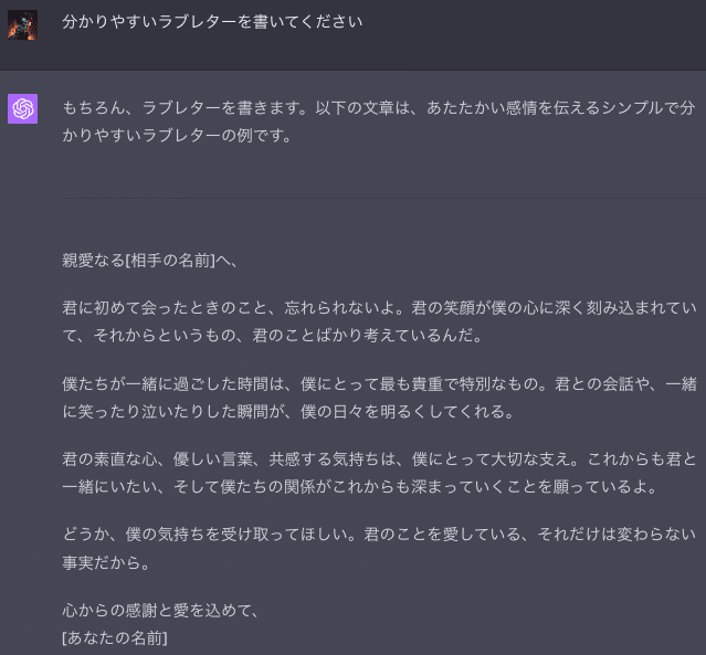 独自のスタイルやトーンを効果的に指定してあげることで、より望む結果に近づくことができます。例えば、以下は「感動的なラブレター」を作成してとお願いした時の出力です。