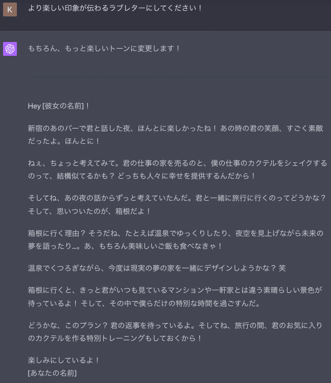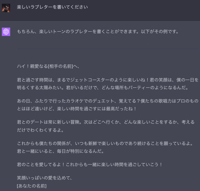 そして、こちらがカジュアルな感じの楽しいラブレターを作成してとお願いした場合。