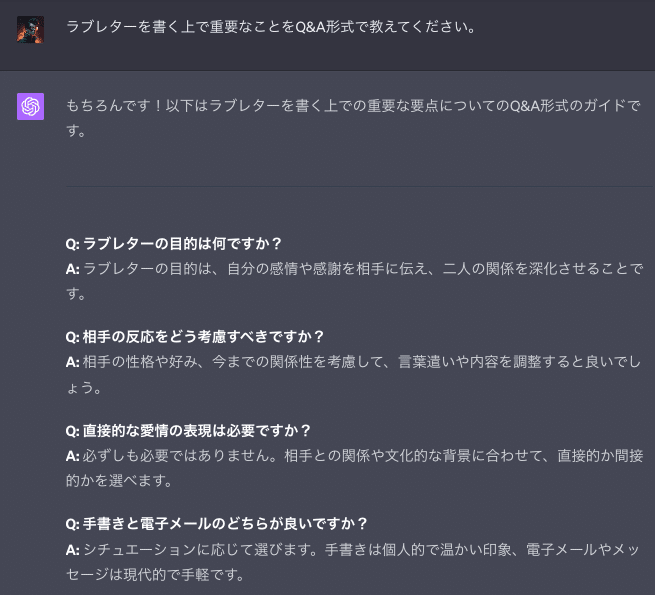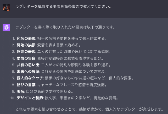 例えば、ChatGPTでラブレターを作成したいと思った場合は、ラブレターの受取人の情報を詳細にChatGPTに教えることで、受取人にあった質の高い文章を作成してくれます。