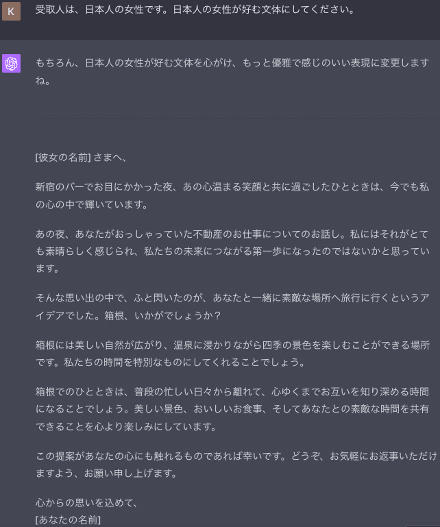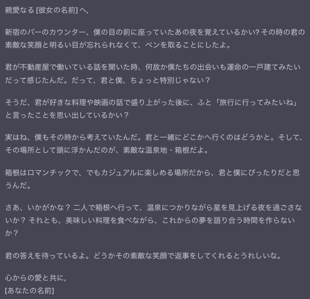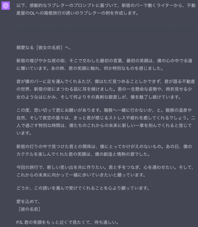 感動的なラブレターを作成するためのプロンプト(ChatGPTへの指示文章). ラブレターの制作者は新宿のバーで働いている.受取人は新宿の不動産屋で働く25歳OLで笑顔が素敵.二人は,制作者のバーで出会った.ラブレターの目標は,一緒に箱根旅行に行くこと.