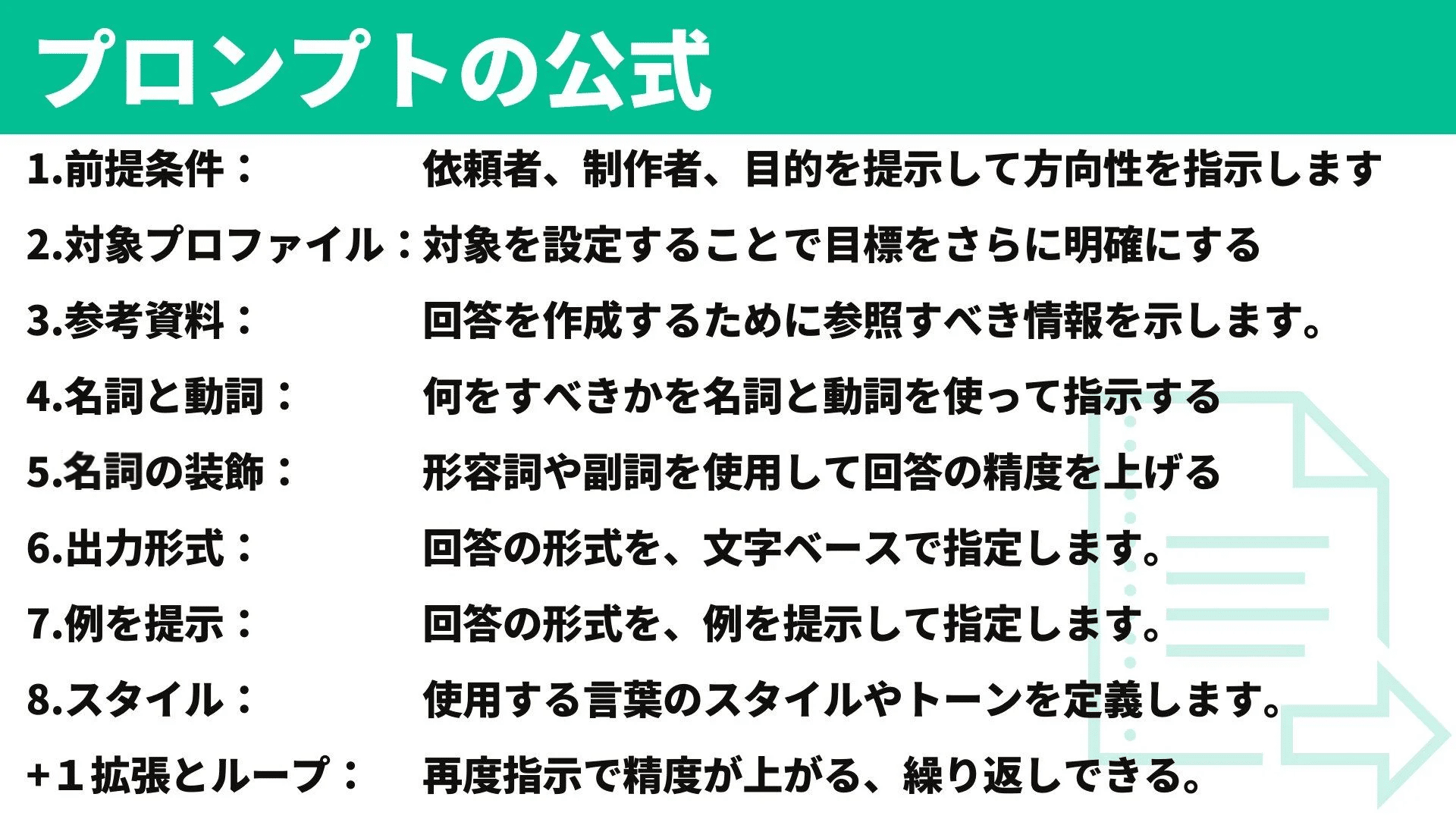 プロンプトは、ChatGPTのような高度なAIを使いこなすためには欠かせない技術となっています。今回は、いま日本で一番 ChatGPT を使い倒している経営者兼プロンプトエンジニアの七里さんが考案した七里式プロンプト「8+1の公式」をご紹介させていただきます(※七里さんの許可を得て紹介しています)。これは、最大限の成果を生み出すためのプロンプト制作に役立つ独自の公式で、ビジネスや個人利用において、効果的な応答を生成するための鍵となります。