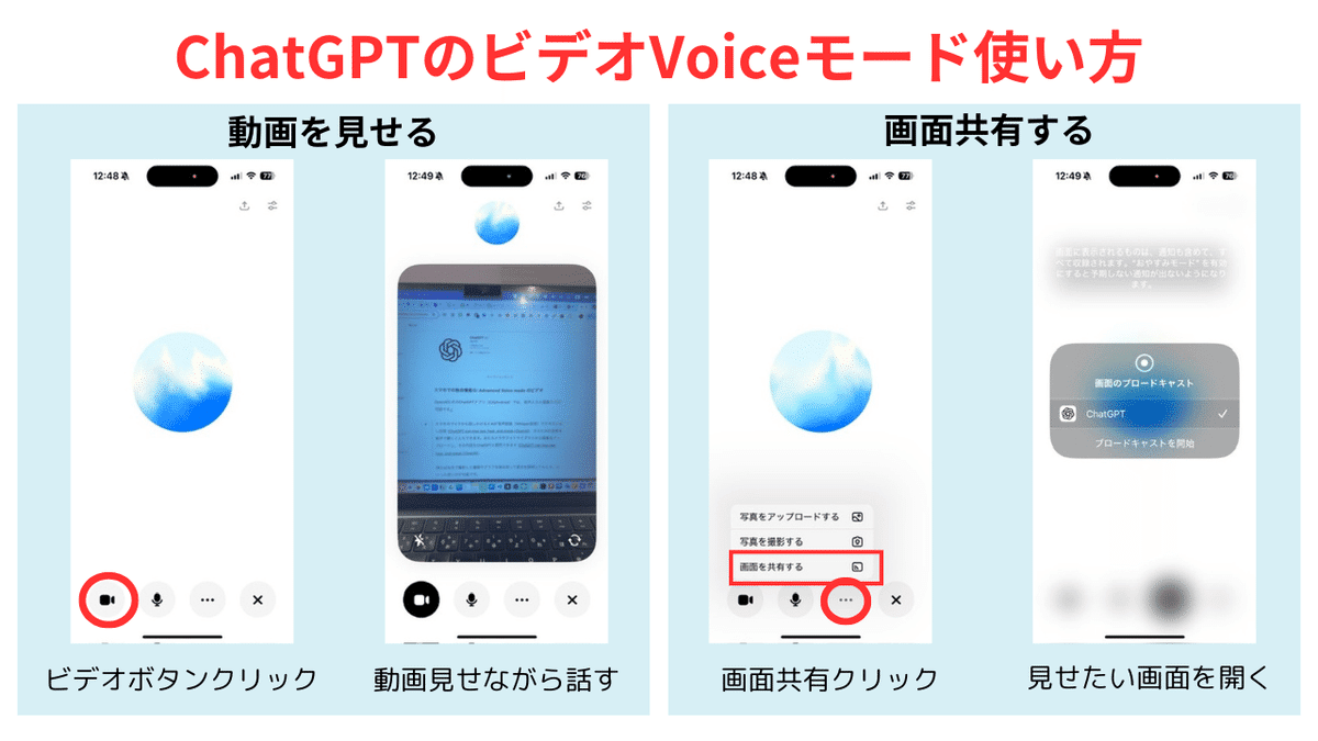 OpenAI公式のChatGPTアプリ(iOS/Android)では、音声入力セットで動画共有・画面共有が可能です。