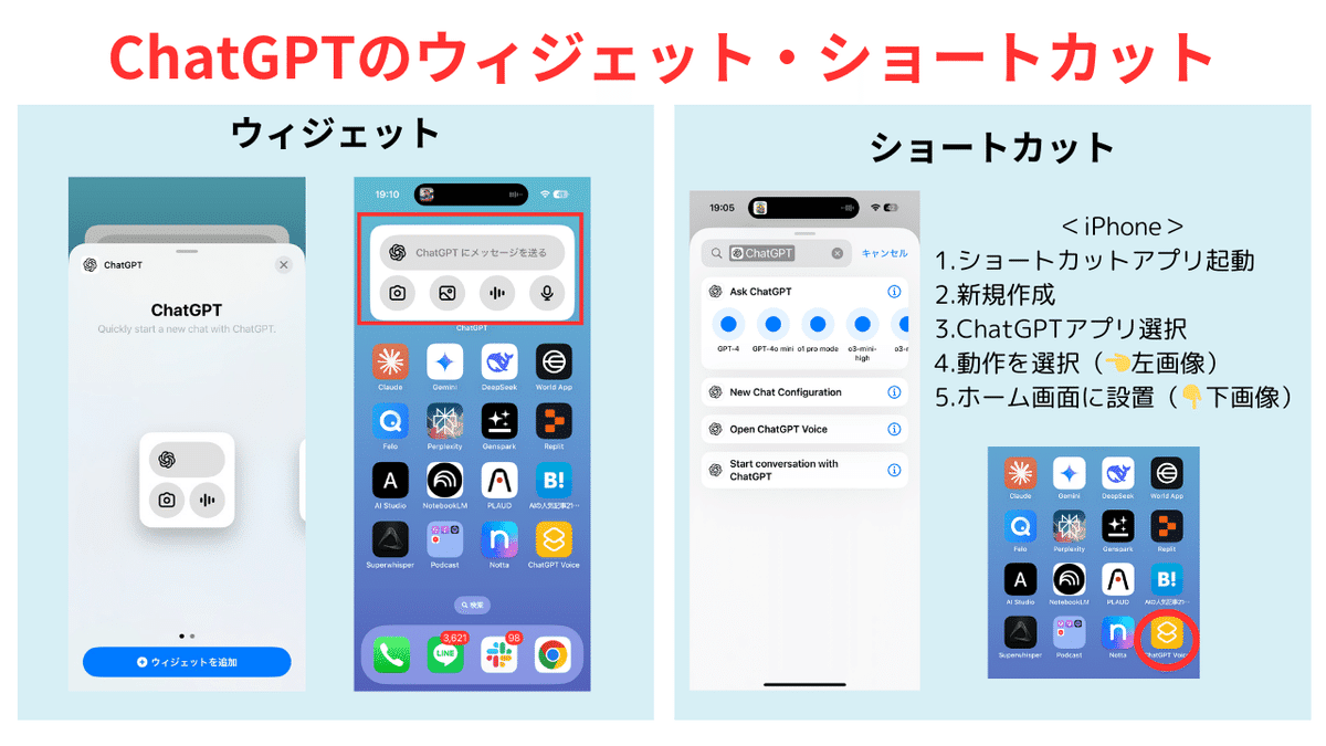 ChatGPTをスマホで利用する際に、起動を早くする方法として「ウィジェット」や「ショートカット」を使うとワンクリックで起動ができます。
