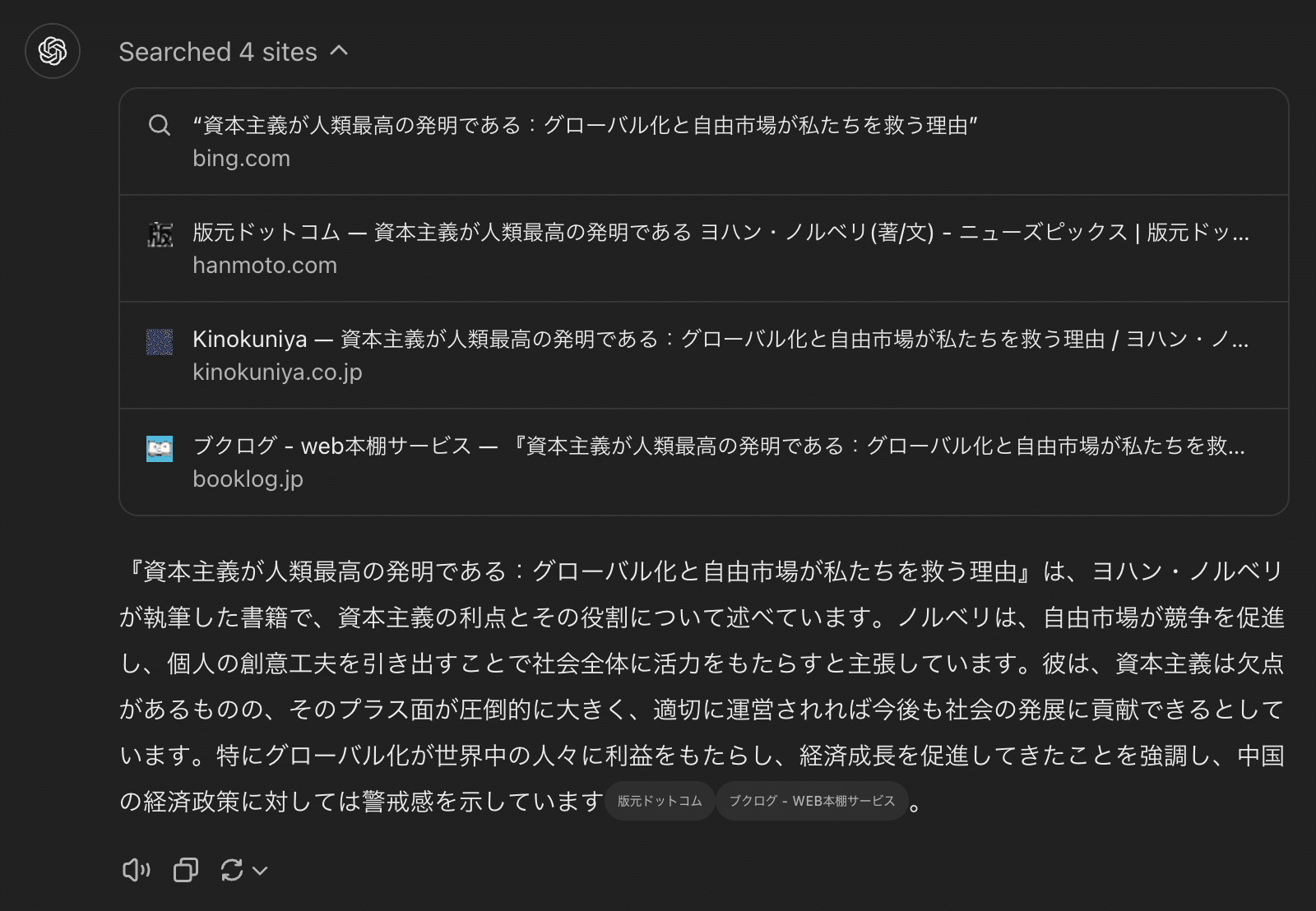 例として、2024年9月30日に出版された「資本主義が人類最高の発明である:グローバル化と自由市場が私たちを救う理由」という本について、ChatGPTに質問してみましょう。