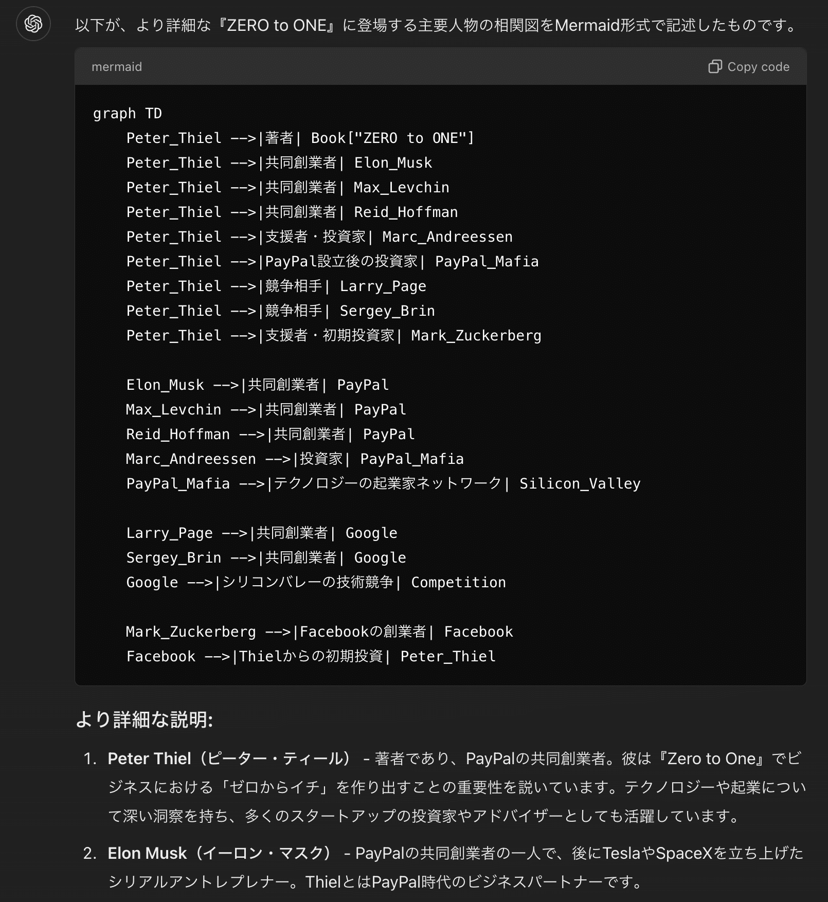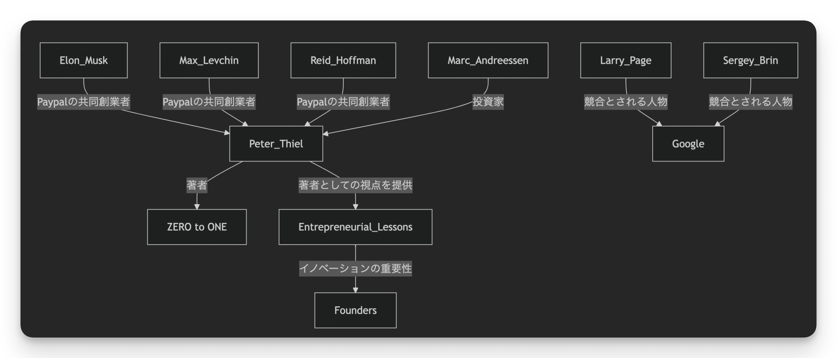 「ZERO to ONE」に登場する主要人物の相関図をMermaid形式で書いて説明してください。