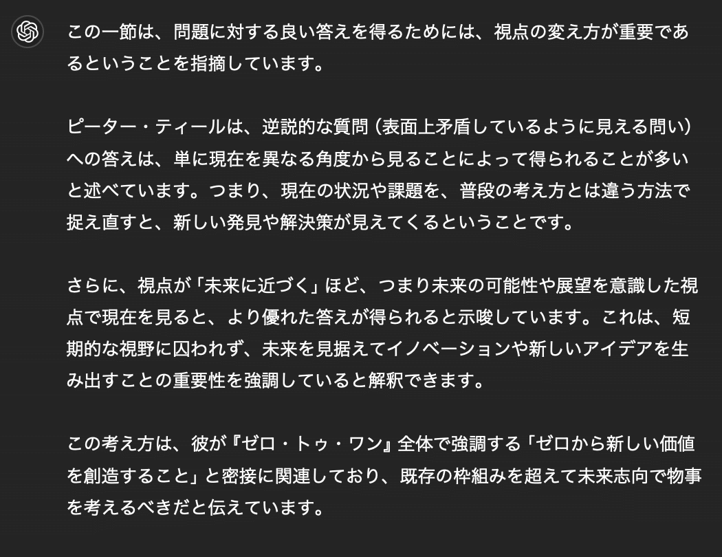 ここでは、ピーター・ティールの著書「ZERO to ONE」を例に、ChatGPTを活用した具体的な読書術をご紹介します。