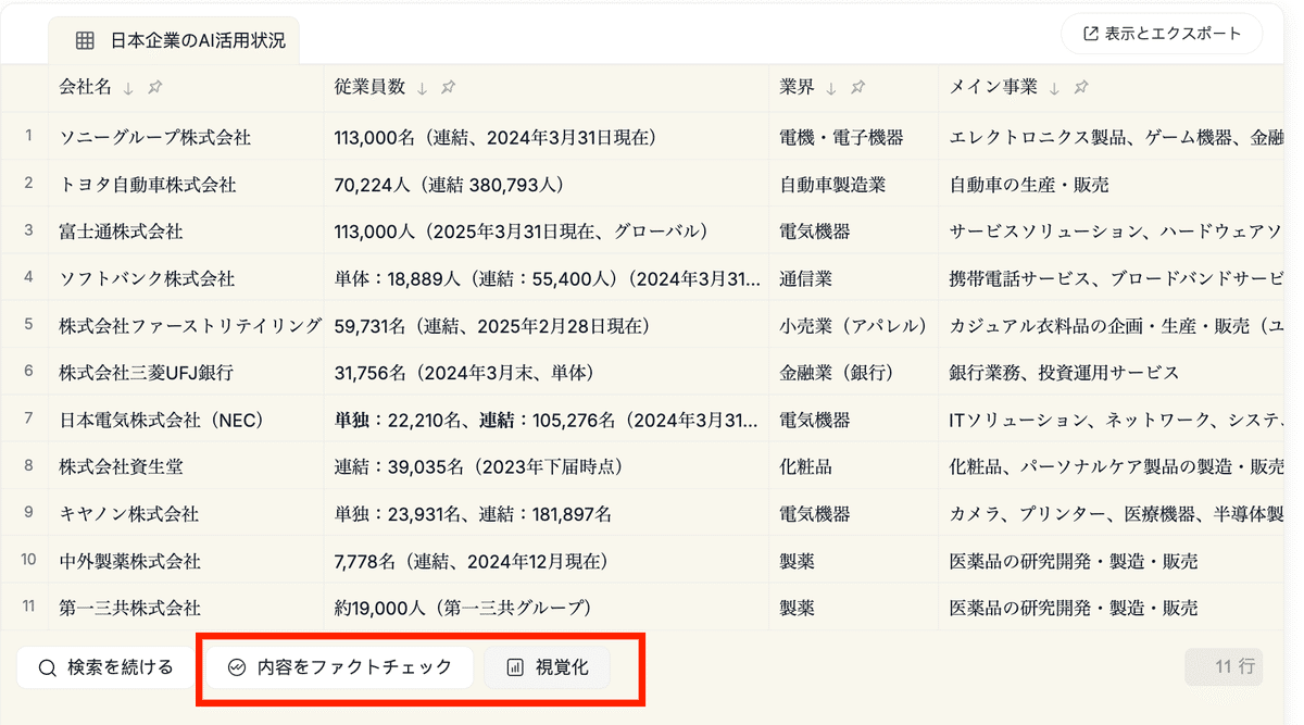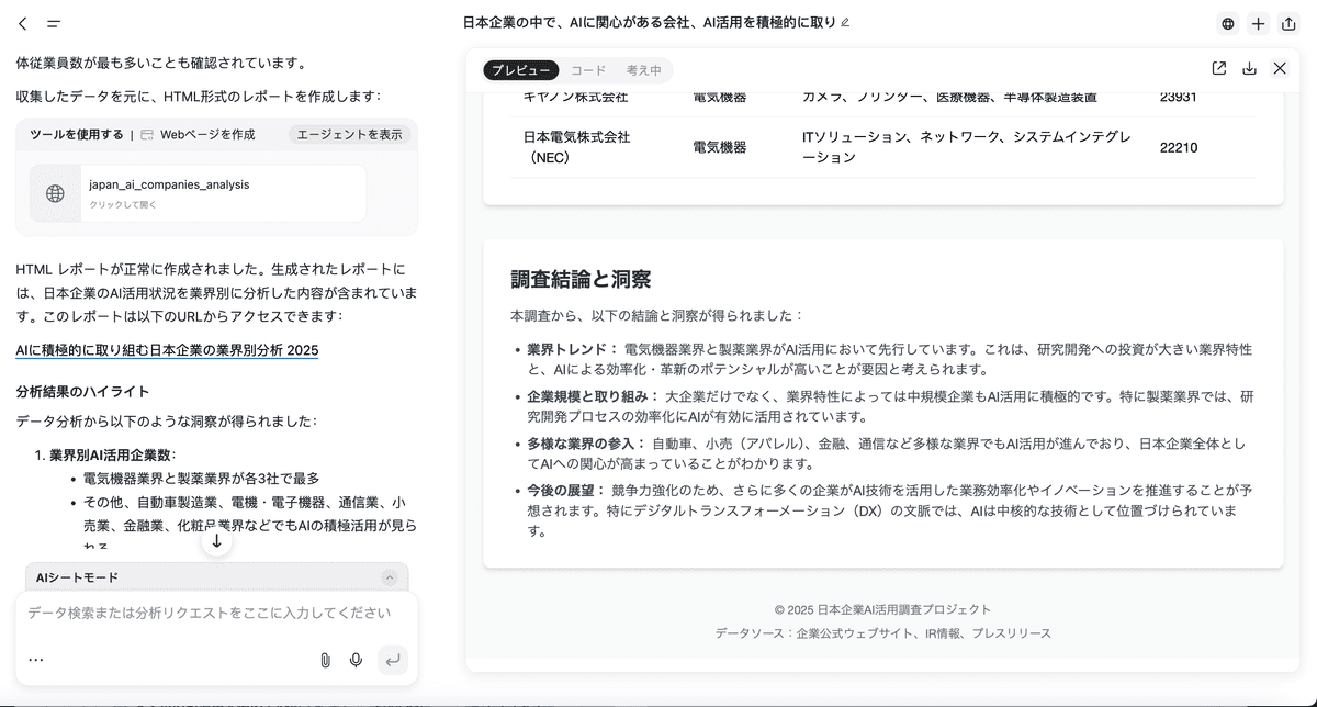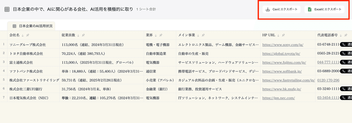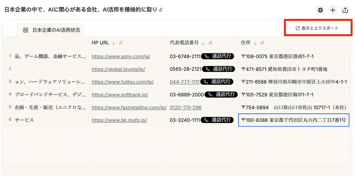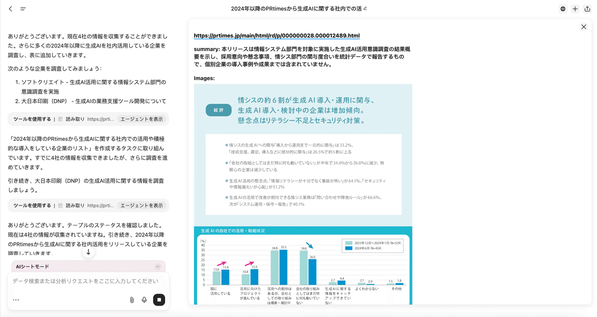ただ企業名や住所だけを調べるだけであれば既存のサービスでもできるので、PRTIMSの中からAIに関するリリースをだしてる企業の情報をリサーチしてまとめてもらう指示をしてみます。