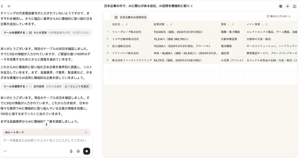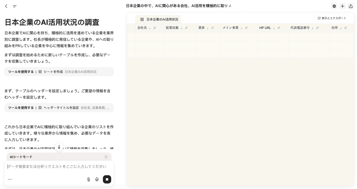 エージェントが情報を検索してきて、シートを埋めてくれます。