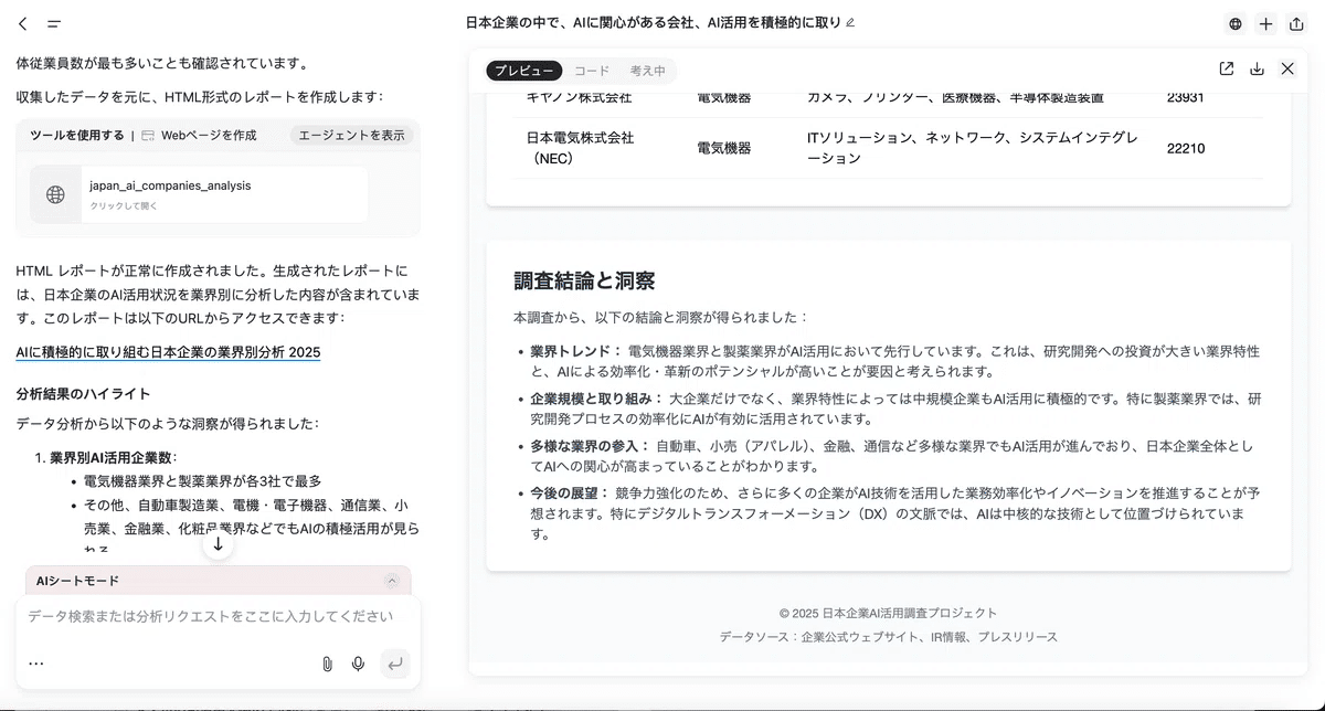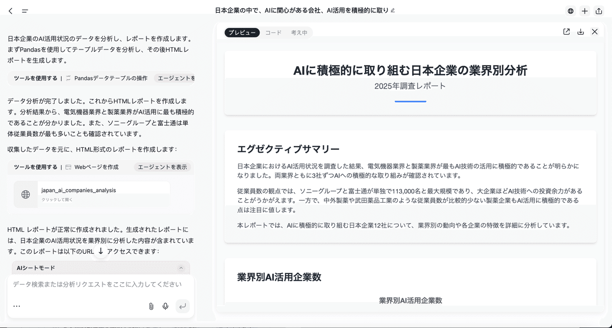 データ分析に特化した機能で、AIエージェントがExcelを操作するようにデータを分析してグラフを作成したり、分析結果をまとめて資料を作成することができます。
