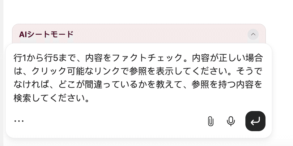 ファクトチェックを押すと、チャット入力欄にファクトチェックに必要なプロンプトが自動で入力されますので、送信することでファクトチェックを実行してくれます。
