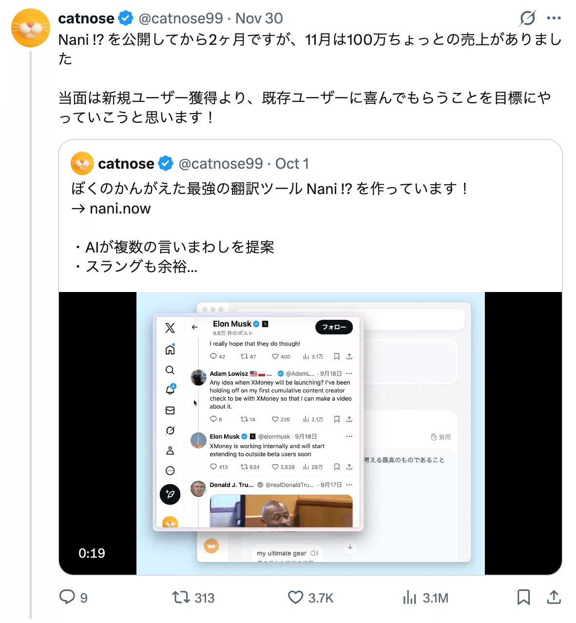 それでも Nani !? は、リリースから数ヶ月で多くのユーザーに使われ、公開2ヶ月目には月次売上が100万円を超えています。開発者の catnose さんが X でその数字を公表しています。
