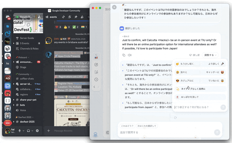 届いたメッセージの内容を理解した後、日本語で返信の下書きを作成し、それをNani !?で英訳するという使い方が強力です。「ビジネスメール」「顧客対応」「少しカジュアルに」といった豊富なプリセットからトーンをボタン一つで調整でき、相手との関係性に合わせた最適な英文を作成できます。