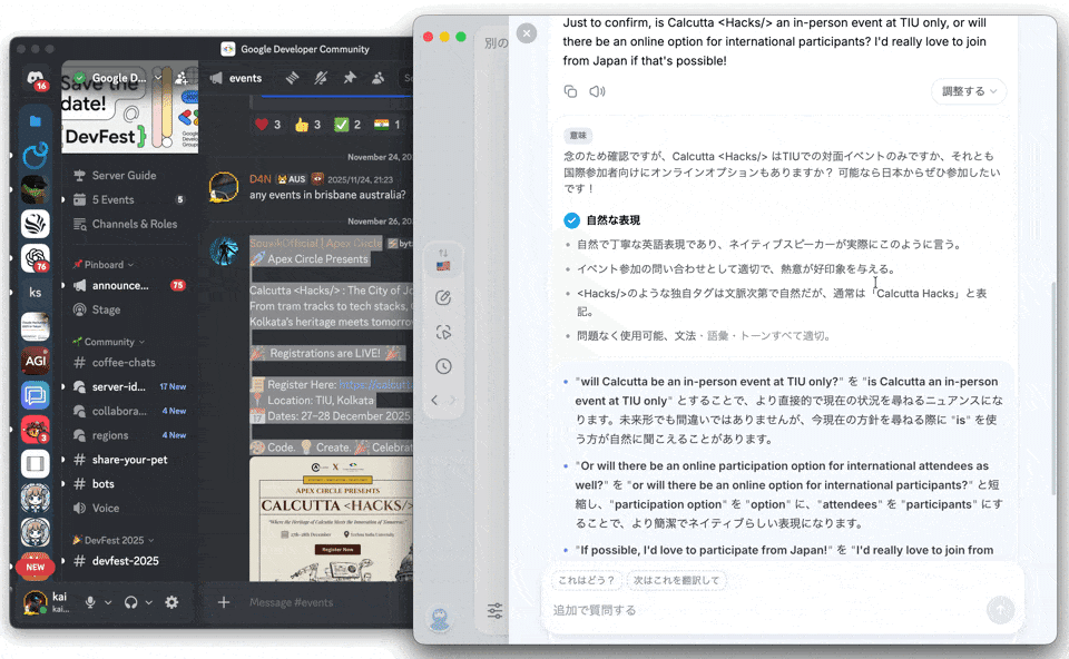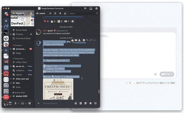 デスクトップ版を利用する場合、上記のようにブラウザ上のチャットに限らずTerminalに出力された英語のエラーログや、エディタ内のコメントなど、あらゆるアプリ上のテキストを同じショートカットで即座に翻訳・解説できます。