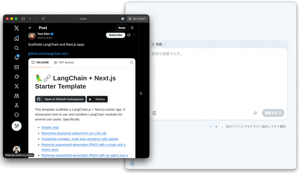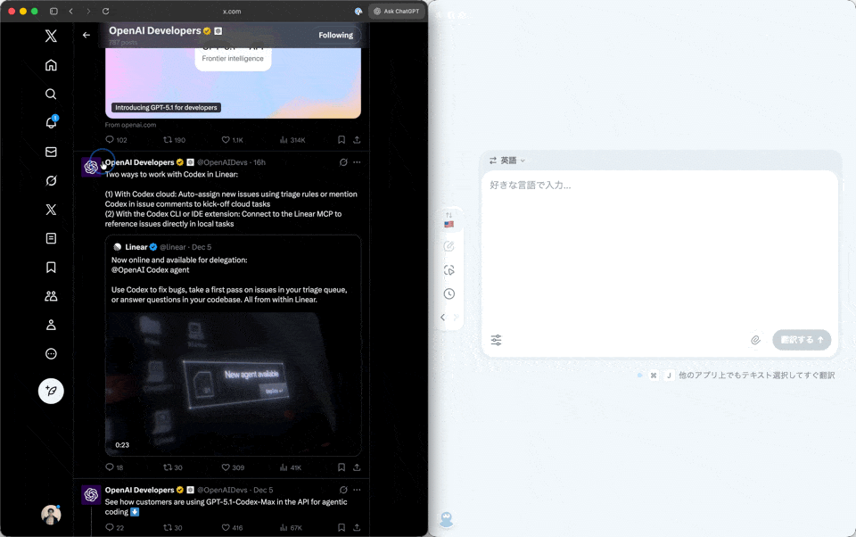 英語のポストを選択し、ショートカット(Cmd+J)でNani !?を呼び出せば、瞬時に翻訳結果と解説が表示されます。初めて使う方は、この起動と翻訳の圧倒的な速さに驚くはずです。