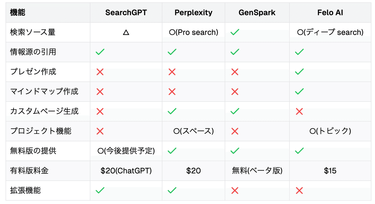 今回、紹介するのはSearchGPT、Perplexity、Genspark、FeloAIの4つです。