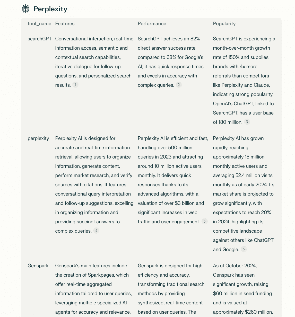 Perplexityは比較表が英語で生成されましたが、特徴、パフォーマンス、人気度の観点での比較表が作成されました。