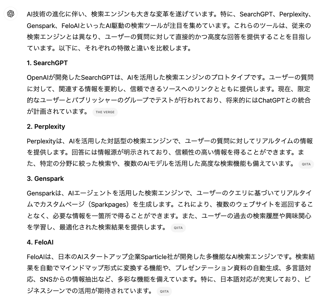 Gensparkの回答はSearchGPTの回答を近しい結果となりました。完結にまとめられており、特徴もわかりやすく説明されています。