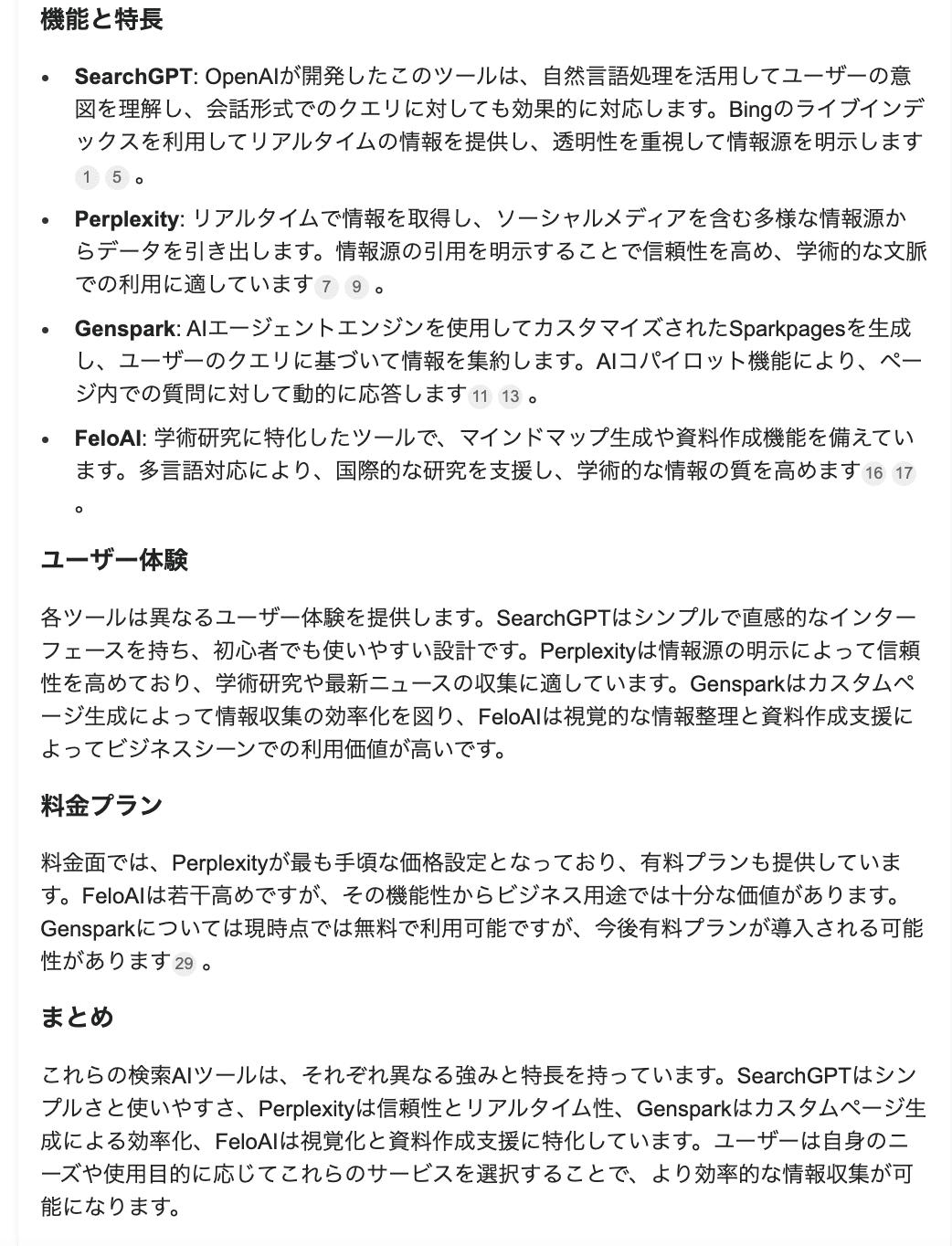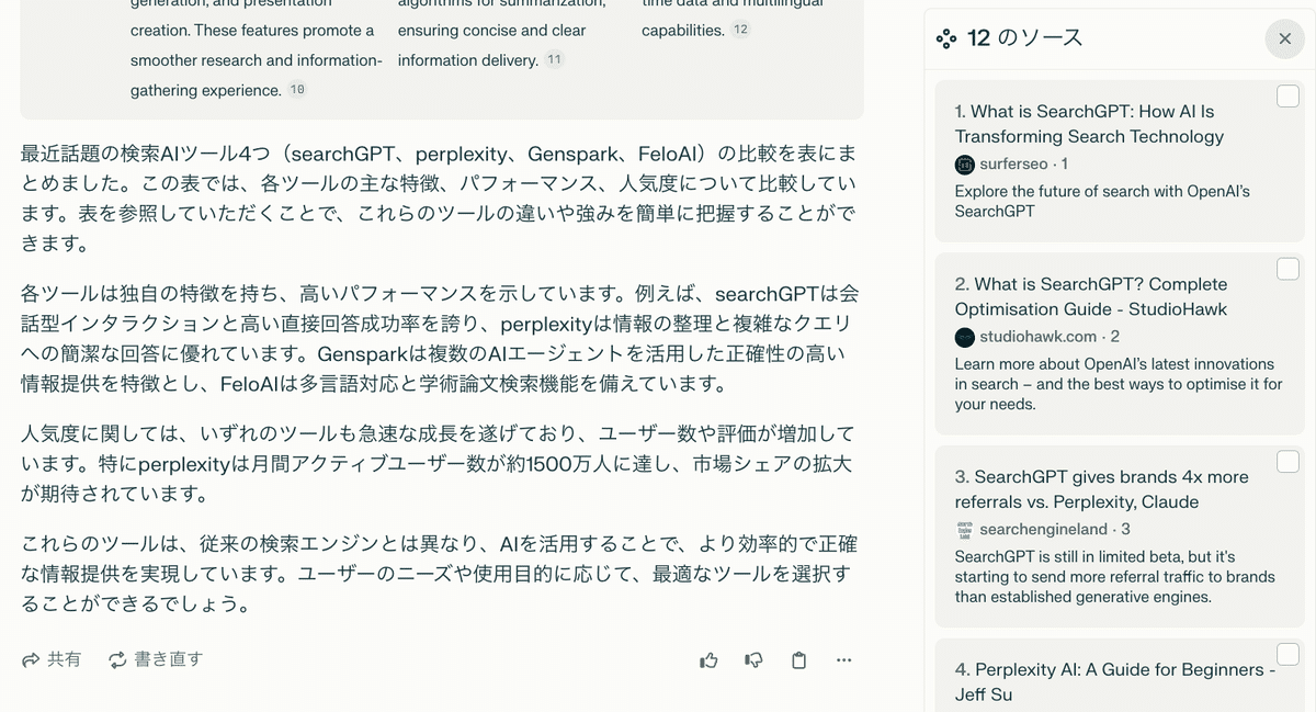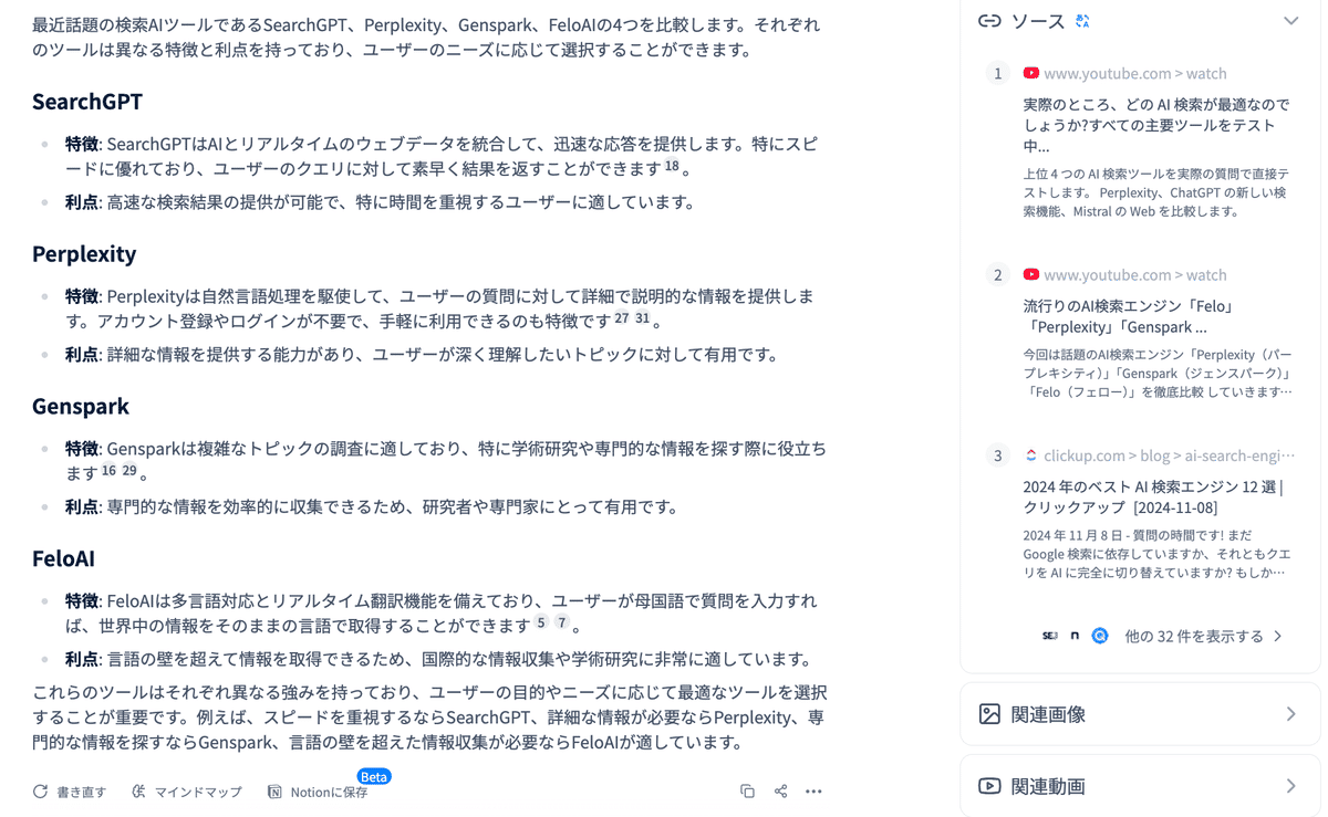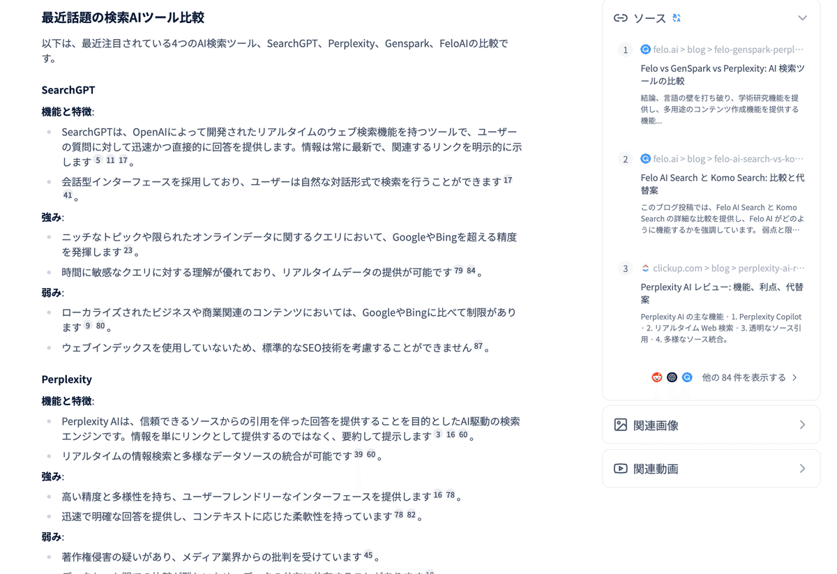 Perplexity、GenSpark、Felo AIは豊富な検索ソースを提供しています。特にFeloAIとGensparkは情報ソースが豊富で深い検索ができる部分で指示されています。