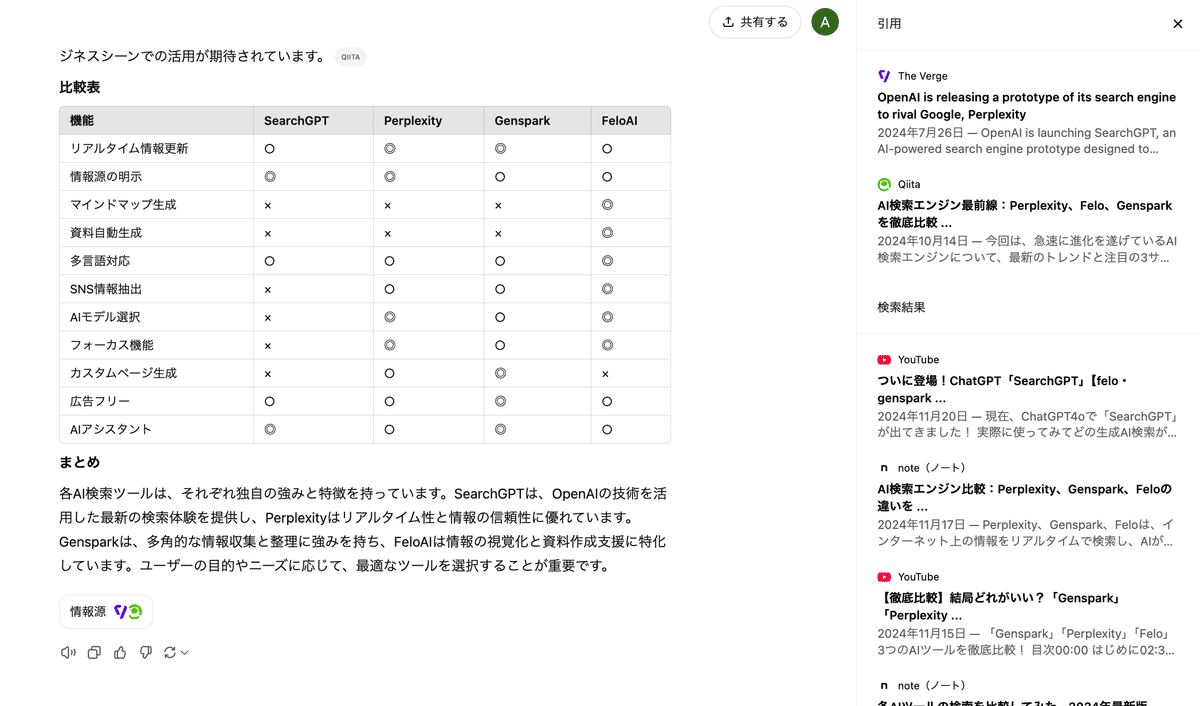 SearchGPTは検索ソース量が他と比べて限定的(△)ですが、情報源の引用機能は備えています。