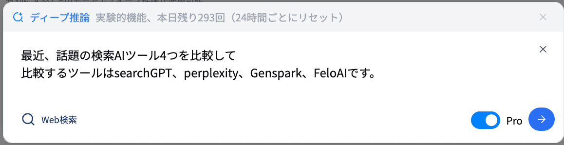 FeloAIは、Pro検索とは別により深い検索ができるディープ検索機能があります。