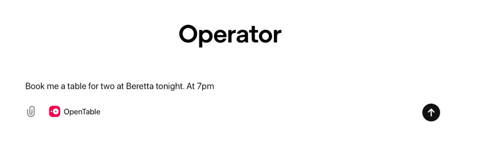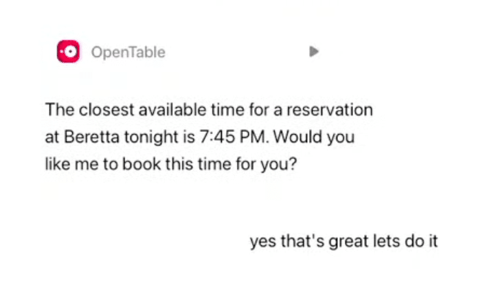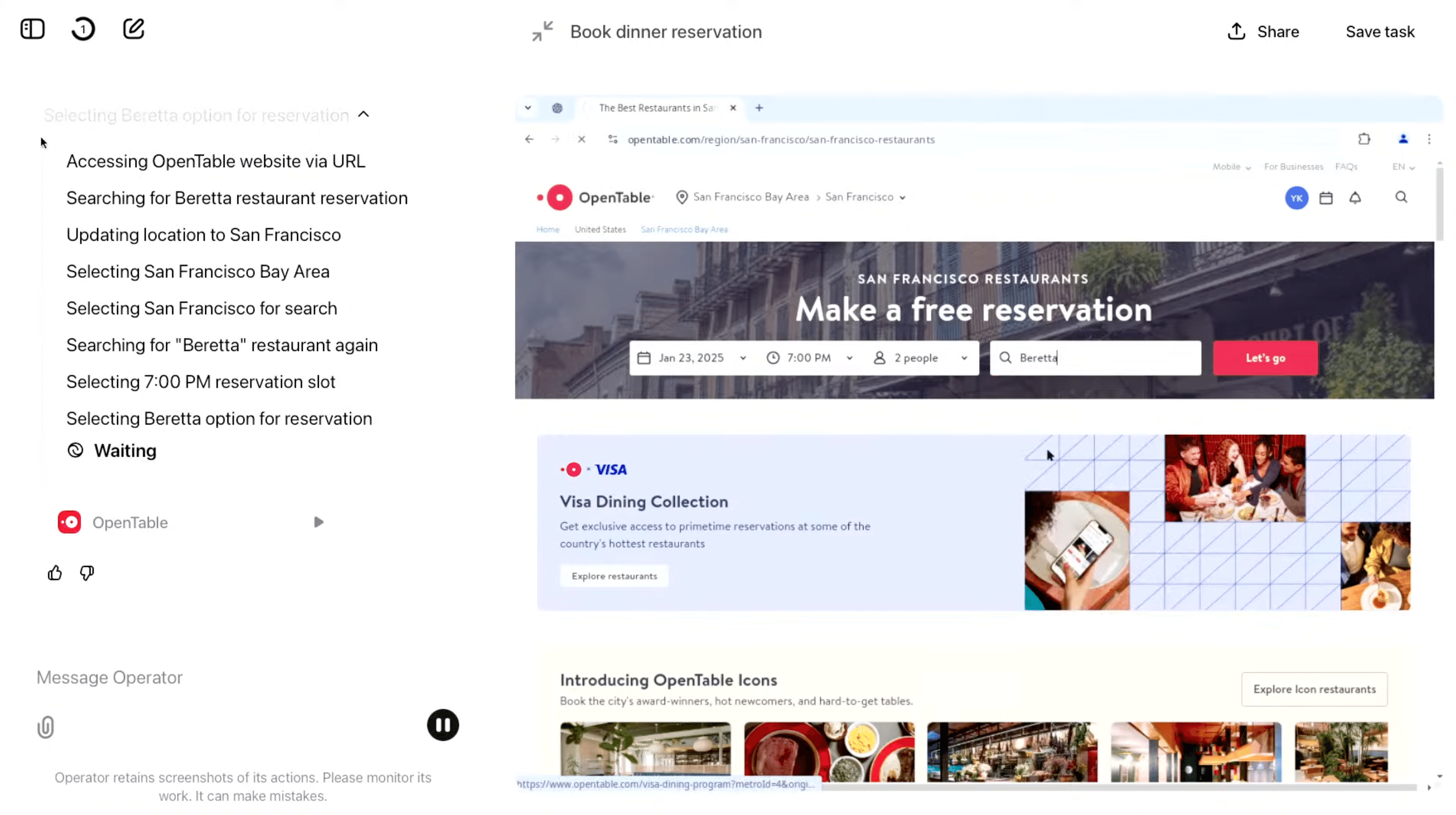 以下のように「レストランで19時に二名分の席を探してほしい」と依頼すると、Operatorが自動でOpenTableなどの予約サイトを開き、候補時間が出るとユーザーに確認を求めるデモが披露されました。