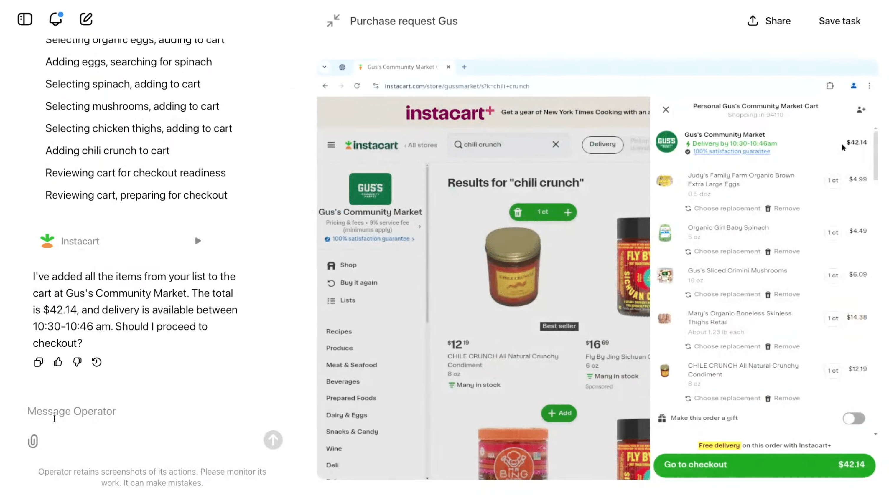 Operator:リストにあった商品をすべて Gus’s Community Market のカートに追加しました。合計金額は 42.14ドルで、配達は 10:30~10:46 に可能です。チェックアウトに進んでもよろしいでしょうか?