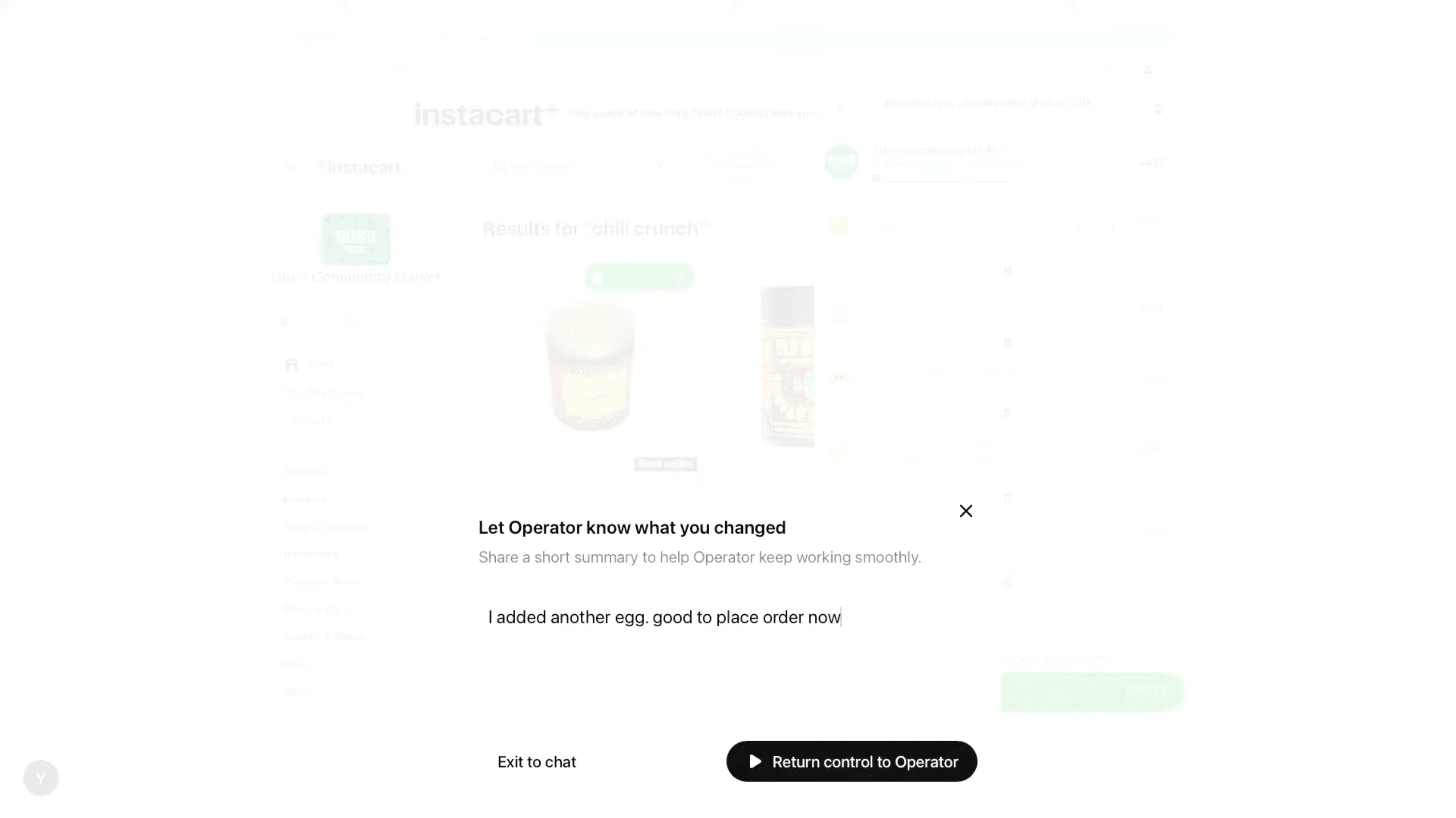 Operator:では、Instacartでリストにある商品を探し始めますね。卵、ほうれん草、マッシュルーム、鶏もも肉、そしてチリクラッチ(チリオイル系の調味料)を中心に探してみます。可能であればGus’s Marketの製品を優先してチェックします。適切な商品が見つかったらカートに追加しますね。このプランで大丈夫でしょうか?