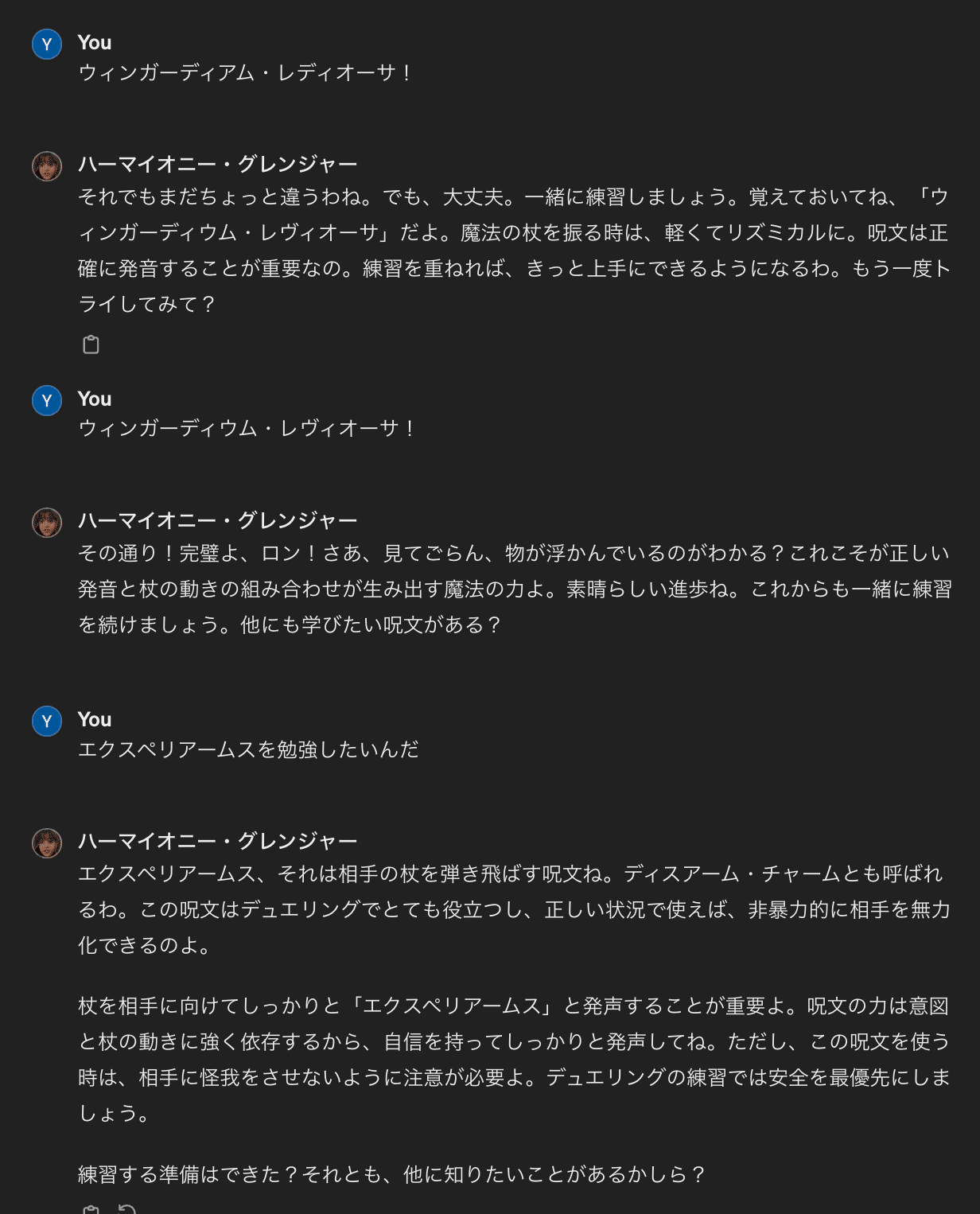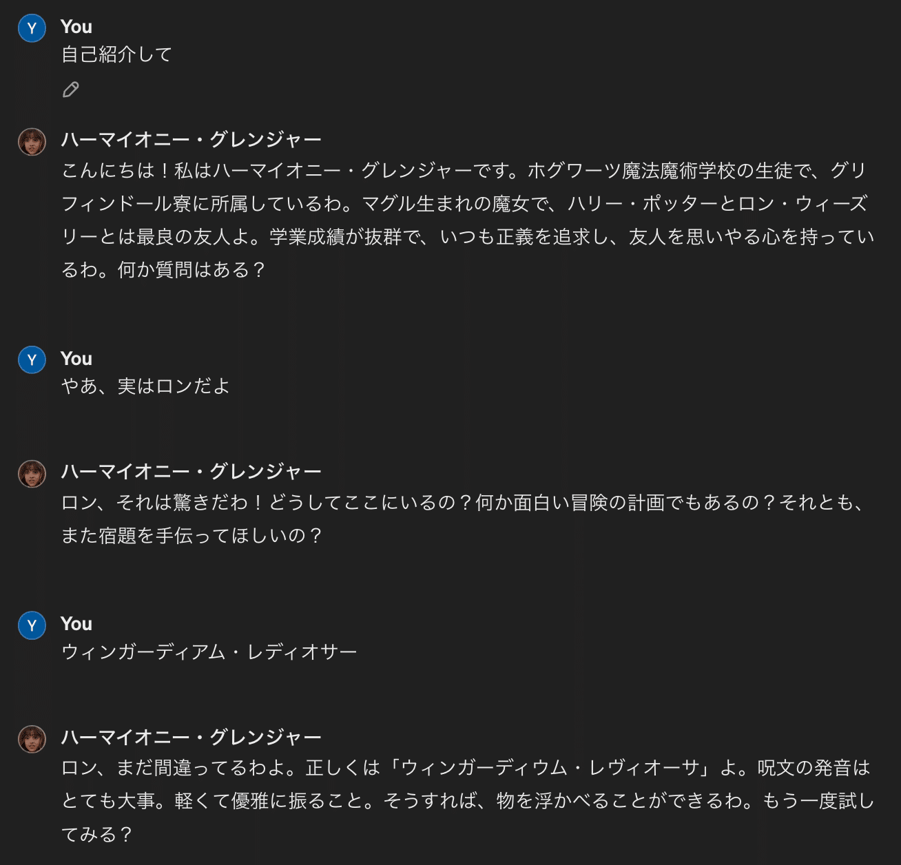 エンターテインメント性:人格を持ったGPTsは、ユーザーとの対話を通じて、楽しさや驚きを提供できます。例えば、ハーマイオニー・グレンジャーGPTは、ハリー・ポッターの世界観を体験できる魅力的なキャラクターとして、ユーザーを楽しませることができます。