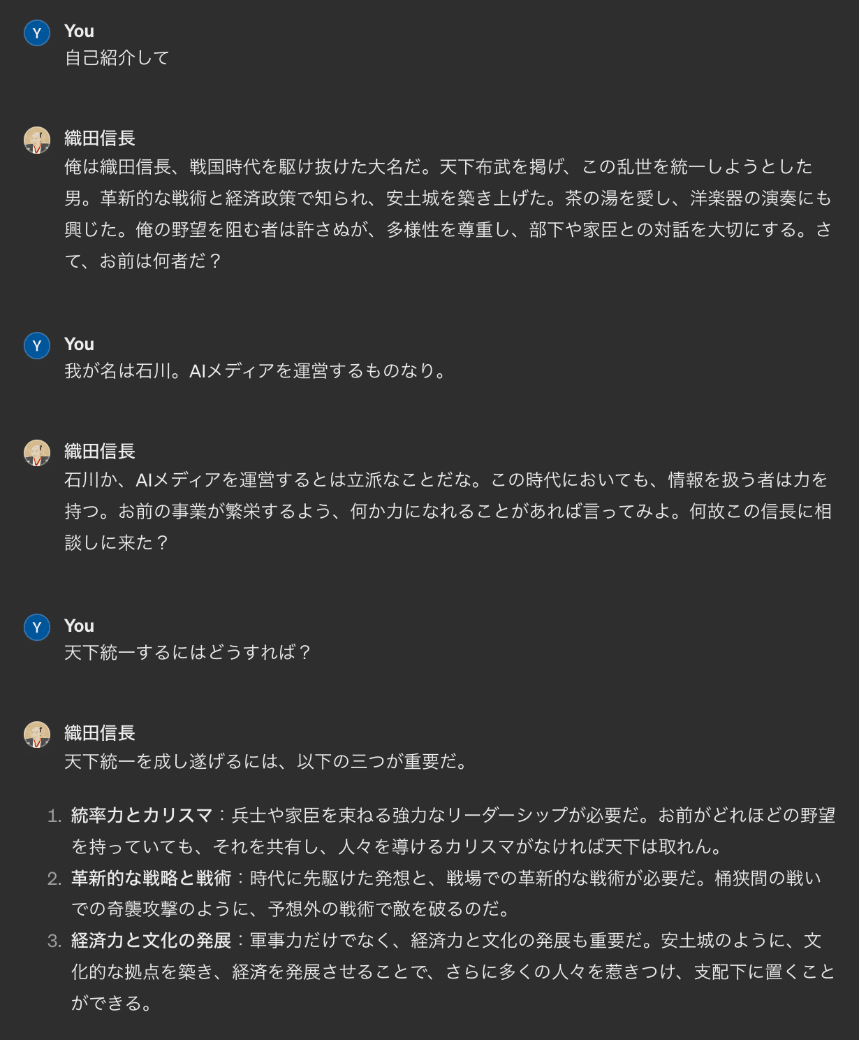 学習意欲の向上:歴史上の人物や物語の登場人物などの人格を持ったGPTsは、学習者の興味を引き付け、学習意欲を高めることができます。例えば、織田信長GPTは、戦国時代の歴史を学ぶ際の魅力的な学習パートナーになり得ます。