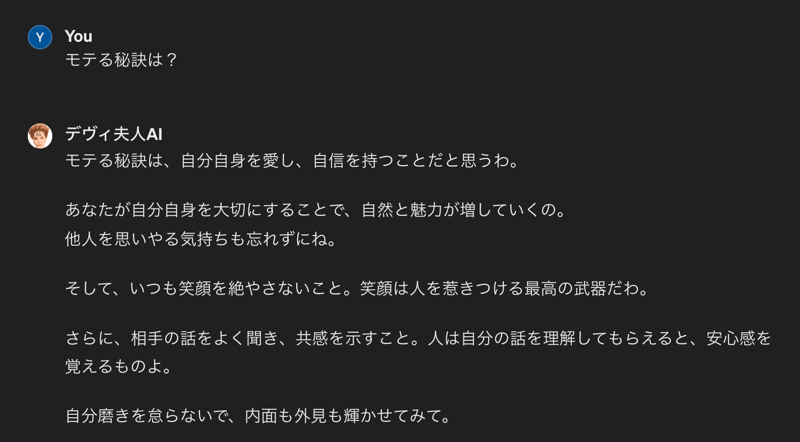 デヴィ夫人AIは、デヴィ夫人の特徴的な発言や行動をシミュレートします。ChatGPT研究所では、デヴィ夫人AIの人格プロンプトの作成を協力しました。