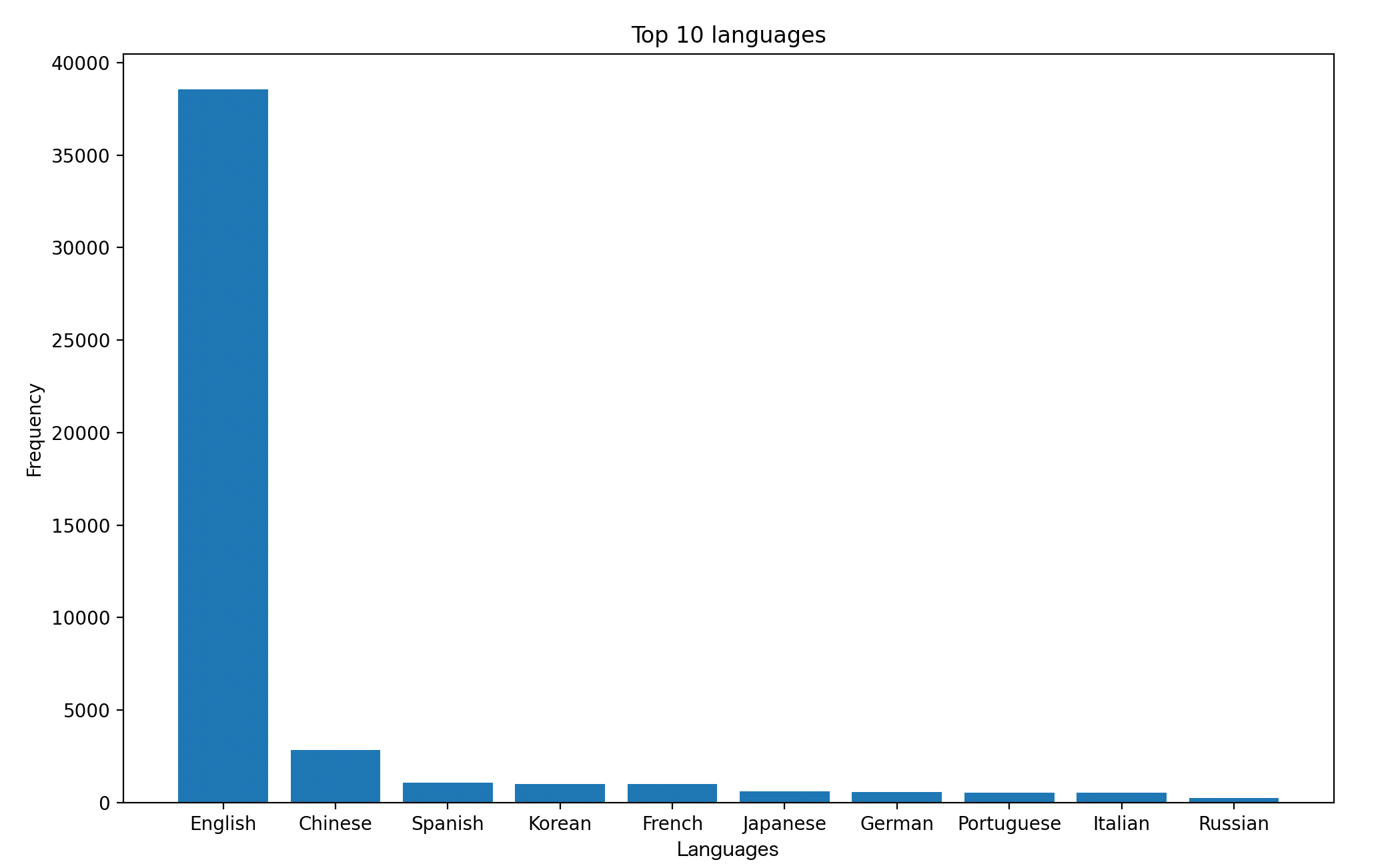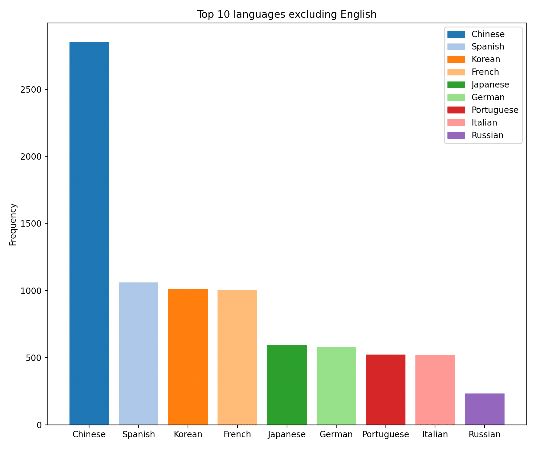 英語が大きすぎて見にくいので、英語を除いて表示すると、中国語、スペイン語、韓国語、フランス語、日本語、ドイツ語、ポルトガル語、イタリア語、ロシア語の順番に多いです。先進国のデータ量が多いことがわかります。中国人もガッツリとChatGPTを使っていることがわかります。